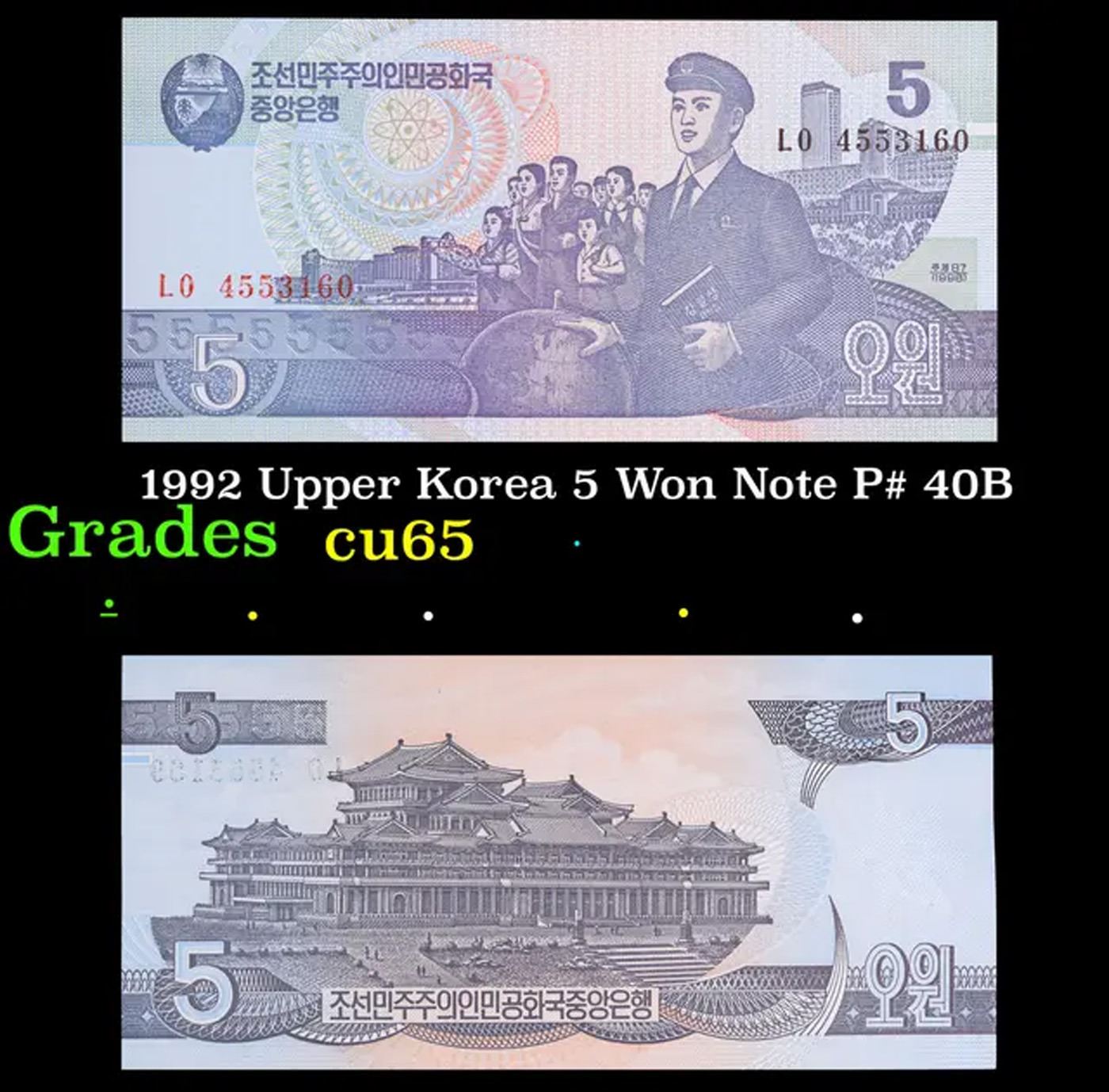 1992 Upper Korea 5 Won Note P# 40B Grades Gem CU