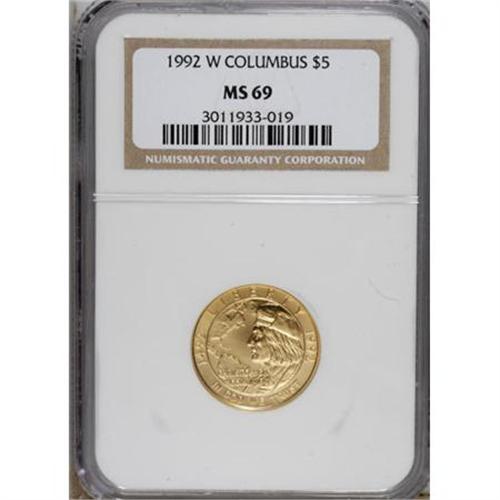 <B>1992-W G$5 Columbus Gold Five Dollar MS69 NGC.</B></I> NGC Census: (353/585). PCGS Population (915/149). Mintage: 24,329. Numismedia Wsl. Price for NGC/PCGS coin in MS69: $220. (#9666)<BR><BR><b>Shipping:</b> Coins & Currency (<a target="_blank" href="http://www.heritageauctions.com/common/shipping.php">view shipping information</a>)