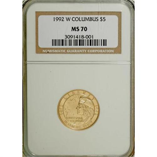 <B>1992-W G$5 Columbus Gold Five Dollar MS70 NGC.</B></I> NGC Census: (610/0). PCGS Population (152/0). Mintage: 24,329. Numismedia Wsl. Price for NGC/PCGS coin in MS70: $324. (#9666)<BR><BR><b>Shipping:</b> Coins & Currency (<a target="_blank" href="http://www.heritageauctions.com/common/shipping.php">view shipping information</a>)