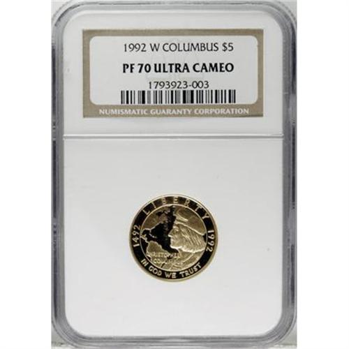 1992-W G$5 Columbus Gold Five Dollar PR70 Deep Cameo