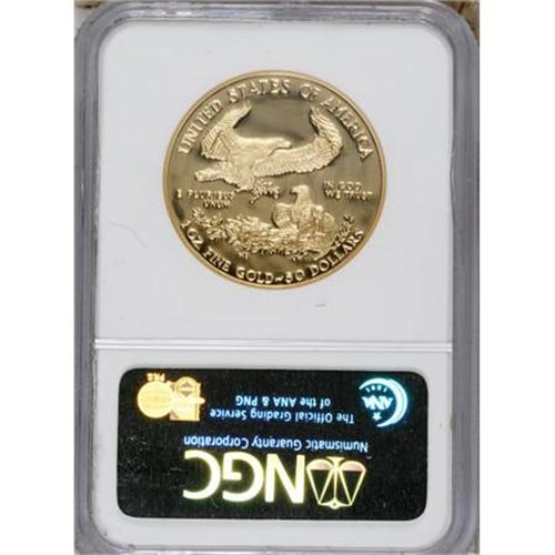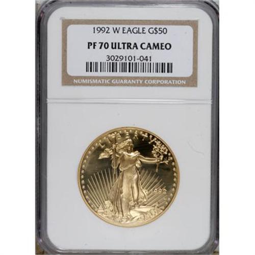 <B>1992-W G$50 One-Ounce Gold Eagle PR70 Ultra Cameo NGC.</B></I> Unimprovable contrast exists between the yellow-gold devices and the deeply mirrored fields. Although the holder has a few hair-thin marks, the coin itself is flawless.<BR><BR><b>Shipping:</b> Coins & Currency (<a target="_blank" href="http://www.heritageauctions.com/common/shipping.php">view shipping information</a>)