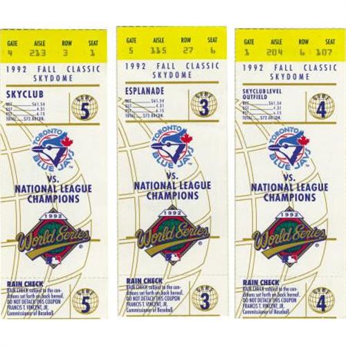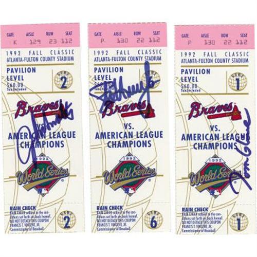<B>1992 World Series Tickets Signed.</B></I> We offer a set of six (6) 1992 World Series Tickets. This World Series is notable for several reasons. This was the first World Series played outside the borders of the United States. Secondly, it was the first World Series won by a team not based in the United States. The Toronto Blue Jays took the series four games to two. The three tickets in this lot that were played in Atlanta are signed by the starting pitchers of that respective game. Game one ticket is signed by Tom Glavine. The game two ticket is signed by John Smoltz, and the game three ticket is signed by Steve Avery. All three signatures are crisp and in blue sharpie. <I>LOA from PSA/DNA.</B></I><BR><BR><b>Shipping:</b> Miscellaneous Collectibles, Smal (<a target="_blank" href="http://www.heritageauctions.com/common/shipping.php">view shipping information</a>)