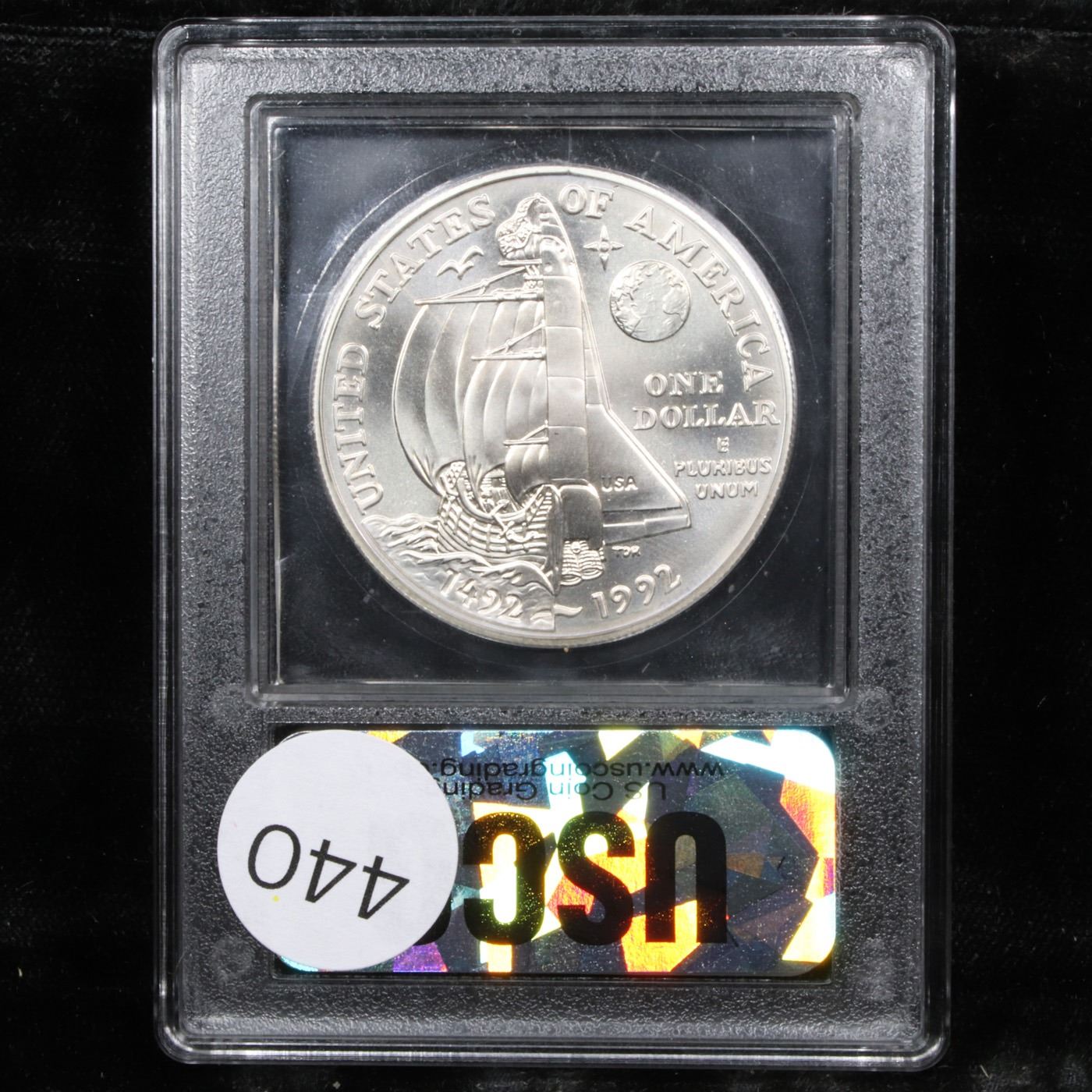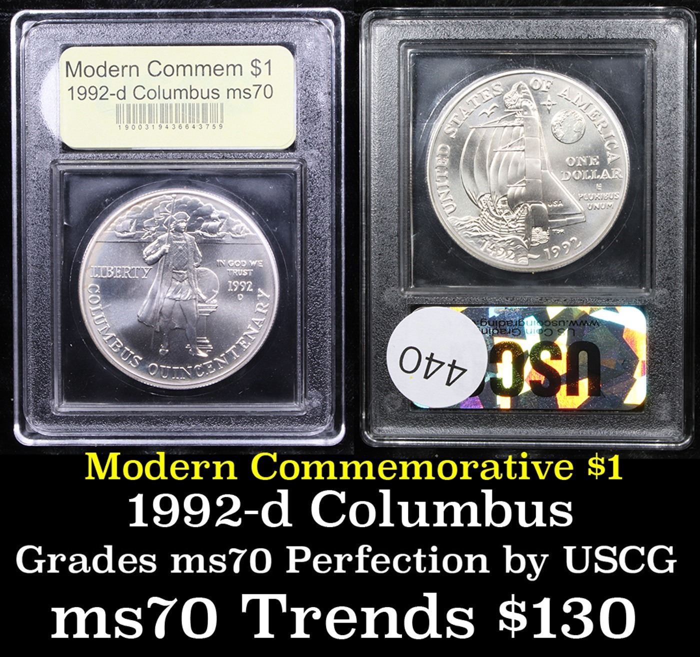 1992-d Columbus Modern Commem Dollar $1 Graded ms70, Perfection By USCG. 0 An amazing design is on the Reverse of this coin with one of Columbus' ships on the left and merged on the Right with the space shuttle, each showing the means of exploration 500 years apart. This Commemorative was issued to mark the 500th anniversary or quincentenary of the discovery of the Americas by Christopher Columbus. This Uncirculated Silver Dollar is graded ms70 by USCG.