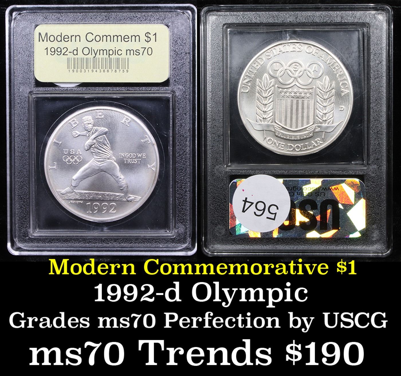 1992-d Olympics Modern Commem Dollar $1 Graded ms70, Perfection By USCG. The 1992 Olympic Silver Dollar was issued for the XXV Olympic Games. The 1992 Olympic Silver Dollar Commemorative coin features a baseball player throwing a pitch. Although it is very similar to an image of Nolan Ryan which appeared on a Fleer baseball card. The designer of the coin John R. Deecken denied that there was any connection.This coin is graded ms70 by USCG.