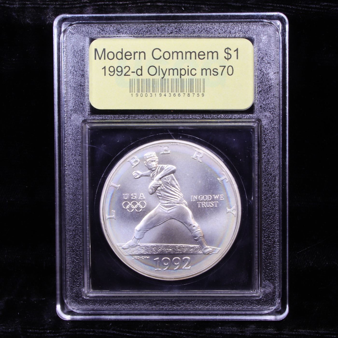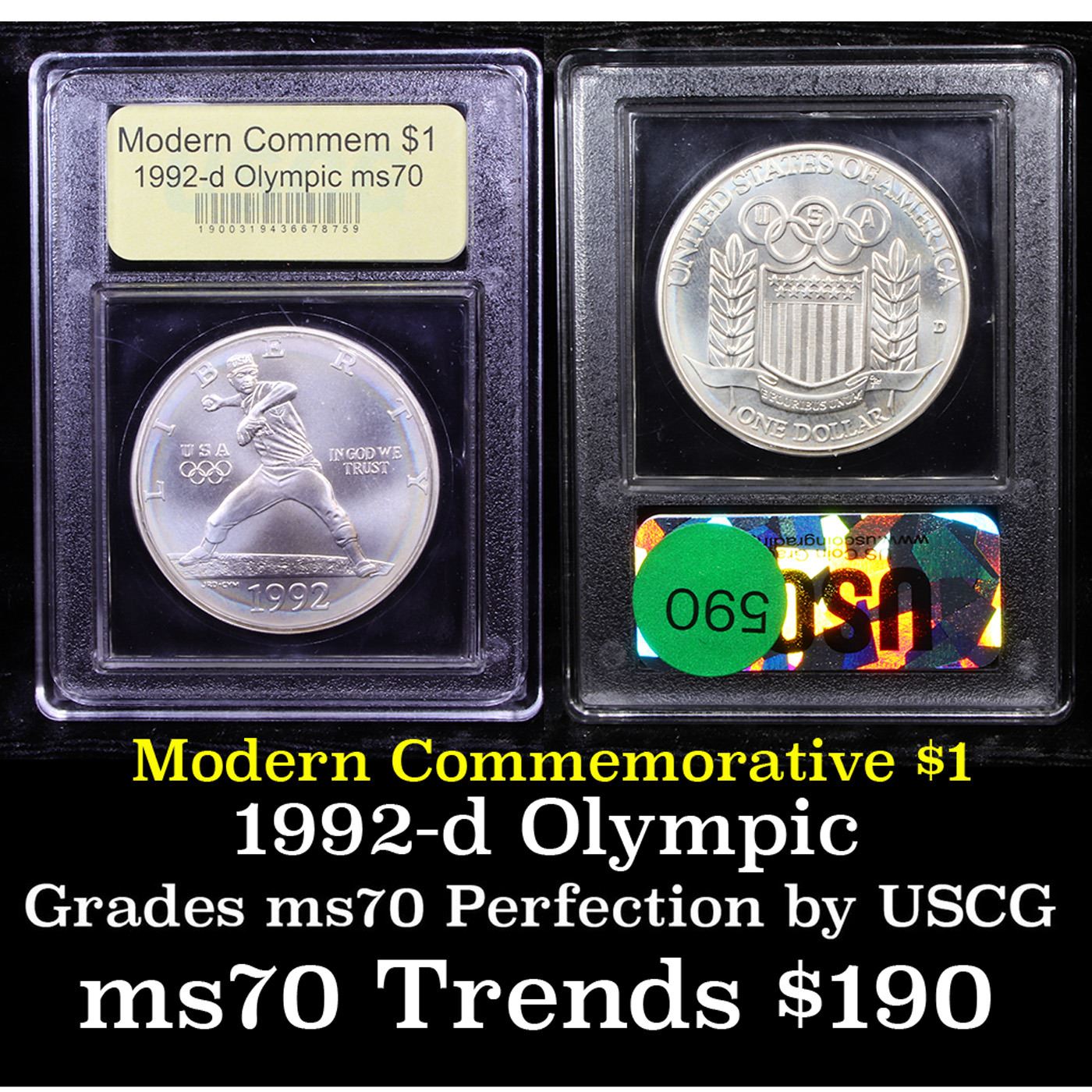 1992-d Olympics Modern Commem Dollar $1 Graded ms70, Perfection By USCG. The 1992 Olympic Silver Dollar was issued for the XXV Olympic Games. The 1992 Olympic Silver Dollar Commemorative coin features a baseball player throwing a pitch. Although it is very similar to an image of Nolan Ryan which appeared on a Fleer baseball card. The designer of the coin John R. Deecken denied that there was any connection. This coin is graded ms70 by USCG.
