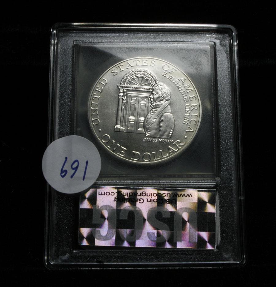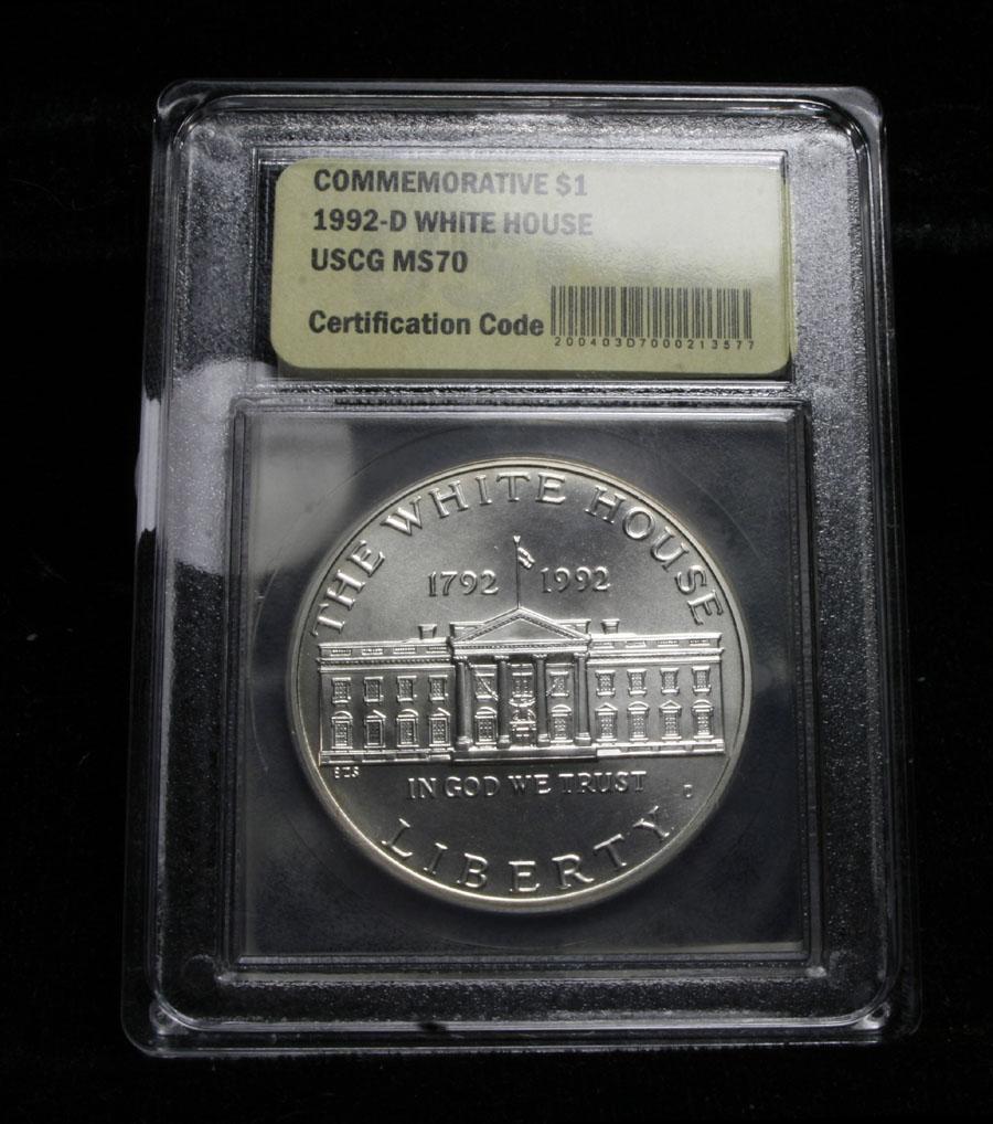 The 1992 White House Silver Dollar was released to mark the 200th anniversary of the White House. The cornerstone for the structure was originally placed on October 13, 1792. This Uncirculated Silver Dollar is graded ms70 by USCG. PCGS lists a ms70 at $450 Estimated Value $150.