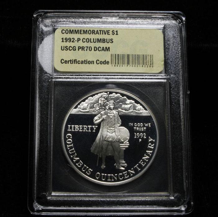 An amazing design is on the Reverse of this coin with one of Columbus' ships on the left and merged on the Right with the space shuttle, each showing the means of exploration 500 years apart. This Commemorative was issued to mark the 500th anniversary or quincentenary of the discovery of the Americas by Christopher Columbus. This proof dollar is graded PF70 by USCG. PCGS lists a PR70 DCAM at $2500 Estimated Value $400.
