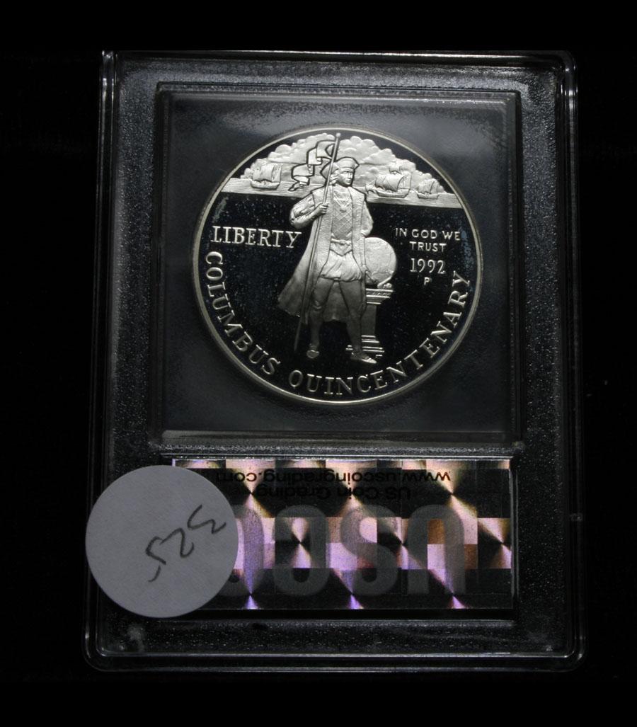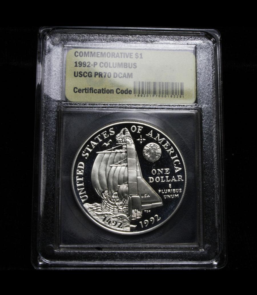 An amazing design is on the Reverse of this coin with one of Columbus' ships on the left and merged on the Right with the space shuttle, each showing the means of exploration 500 years apart. This Commemorative was issued to mark the 500th anniversary or quincentenary of the discovery of the Americas by Christopher Columbus. This proof dollar is graded PF70 by USCG. PCGS lists a PR70 DCAM at $2500 Estimated Value $400.