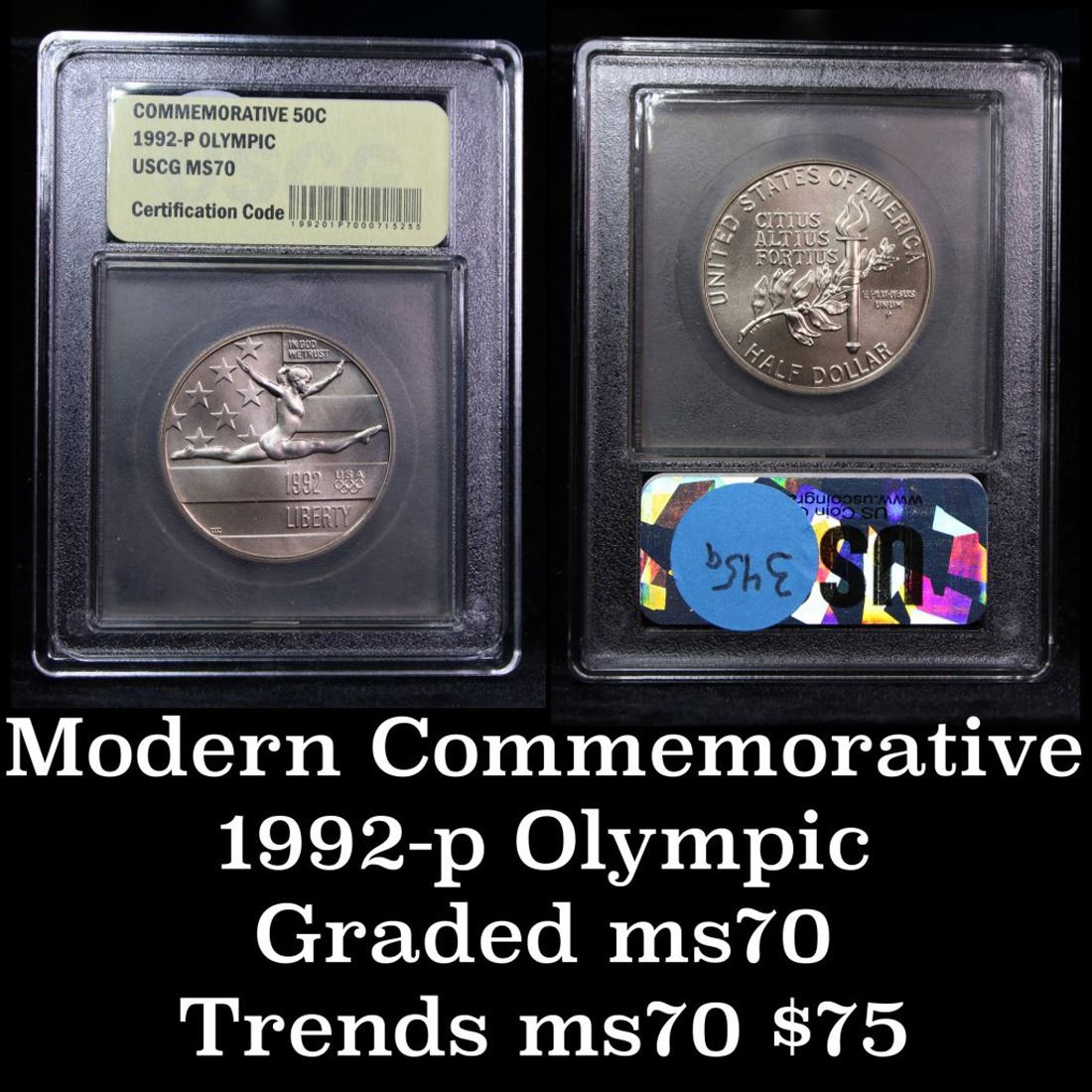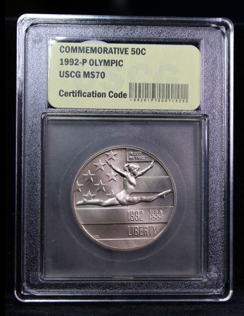 1992-p Olympics . . Proof Commem Half Dollar 50c Graded ms70, Perfection By USCG. The 1992 Olympic Silver Dollar was issued for the XXV Olympic Games. The 1992 Olympic Silver Dollar Commemorative coin features a baseball player throwing a pitch. Although it is very similar to an image of Nolan Ryan which appeared on a Fleer baseball card. The designer of the coin John R. Deecken denied that there was any connection. PCGS lists this coin as very scarce. This coin is graded Perfect Gem+++ Proof DCAM by USCG.
