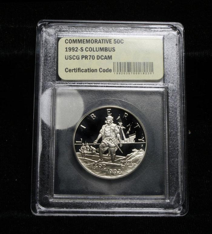 This very special Commemorative was issued to mark the 500th anniversary or quincentenary of the discovery of the Americas by Christopher Columbus. One Hundred years earlier in 1892 America issued a similar commemorative Half Dollar, our first half Dollar Commemorative, which honored the 400th Anniversary. A very significant Issue. PCGS lists PR70 DCAM at $525. This proof half dollar is graded PF70 by USCG. Estimated Value $125