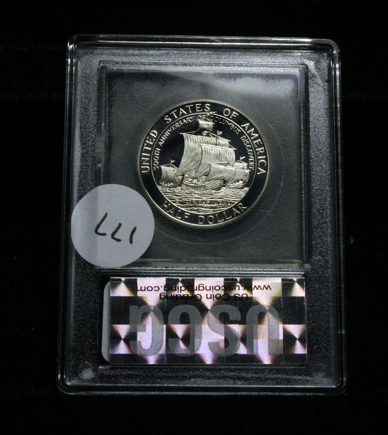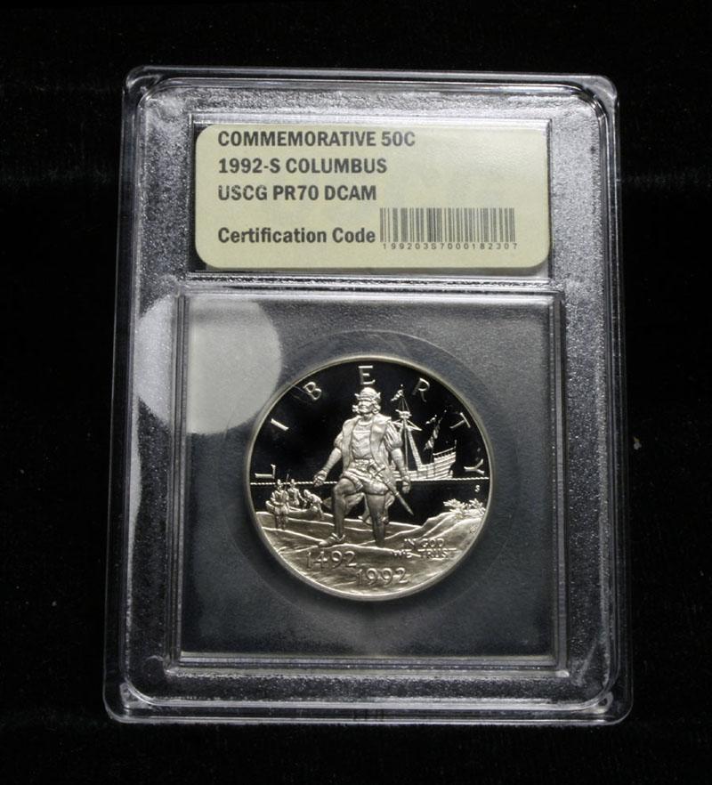This very special Commemorative was issued to mark the 500th anniversary or quincentenary of the discovery of the Americas by Christopher Columbus. One Hundred years earlier in 1892 America issued a similar commemorative Half Dollar, our first half Dollar Commemorative, which honored the 400th Anniversary. A very significant Issue. PCGS lists PR70 DCAM at $525. This proof half dollar is graded PF70 by USCG. Estimated Value $125