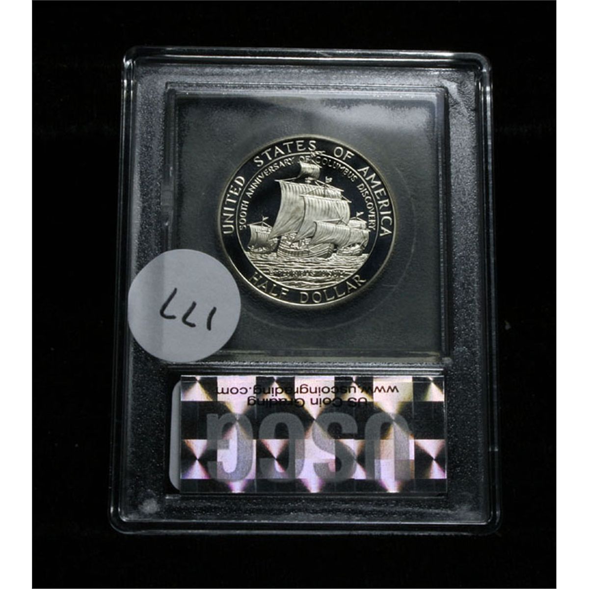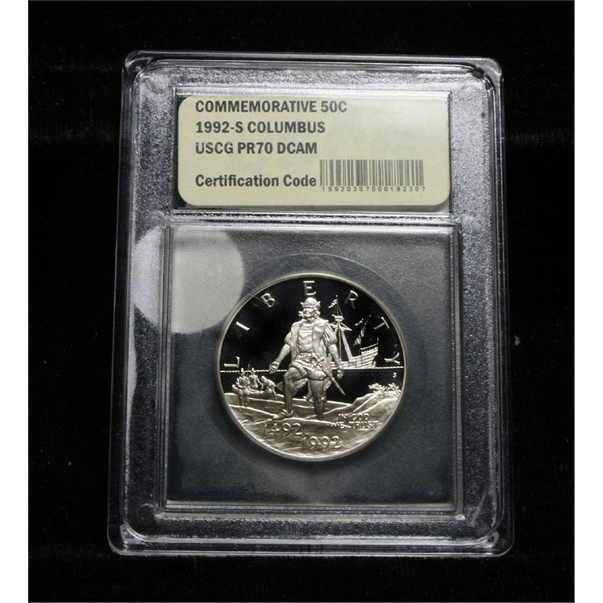 This very special Commemorative was issued to mark the 500th anniversary or quincentenary of the discovery of the Americas by Christopher Columbus. One Hundred years earlier in 1892 America issued a similar commemorative Half Dollar, our first half Dollar Commemorative, which honored the 400th Anniversary. A very significant Issue. PCGS lists PR70 DCAM at $525. This proof half dollar is graded PF70 by USCG. Estimated Value $125