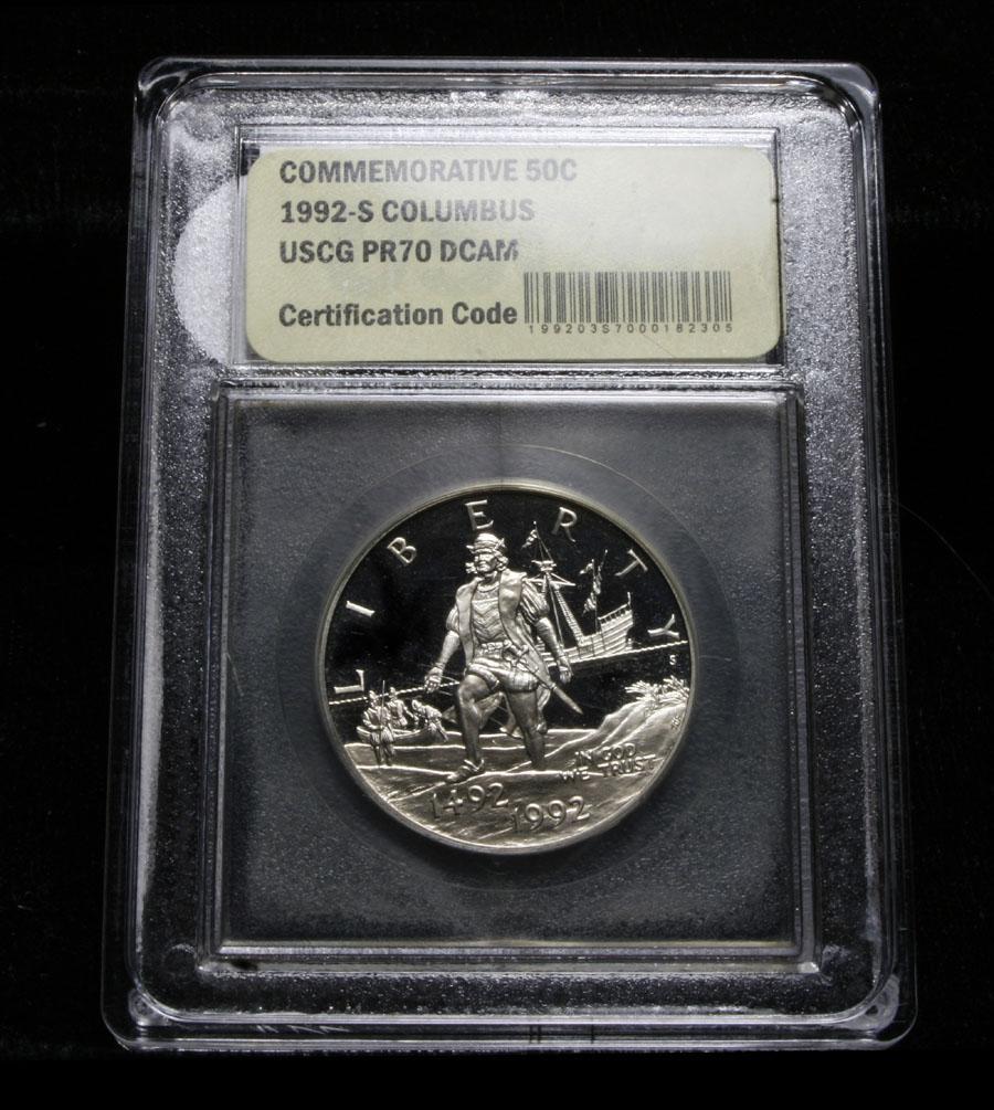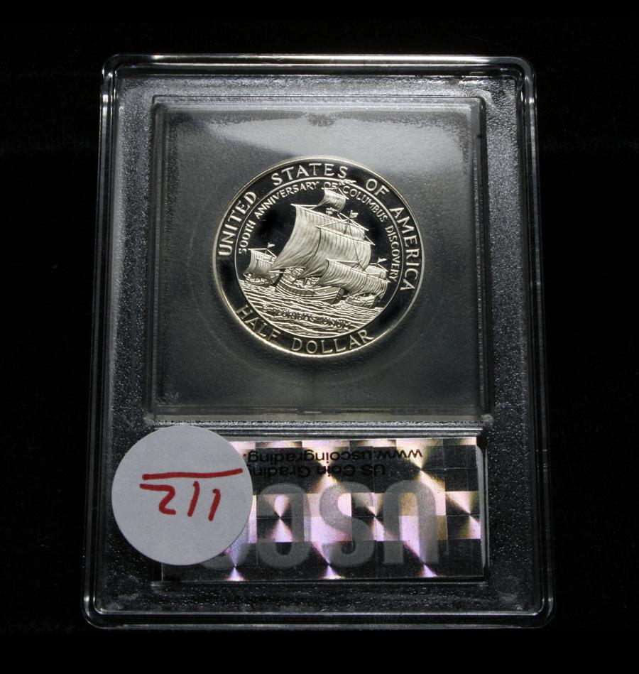 This very special Commemorative was issued to mark the 500th anniversary or quincentenary of the discovery of the Americas by Christopher Columbus. One Hundred years earlier in 1892 America issued a similar commemorative Half Dollar, our first half Dollar Commemorative, which honored the 400th Anniversary. A very significant Issue. PCGS lists PR70 DCAM at $525. This proof half dollar is graded PF70 by USCG. Estimated Value $125