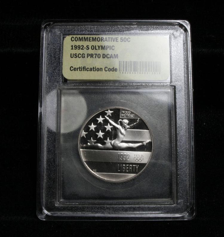 The 1992 Olympic Proof Half Dollar was issued for the XXV Olympic Games. PCGS lists PR70 DCAM at $550. This coin is graded PR70 DCAM by USCG. Estimated Value $150