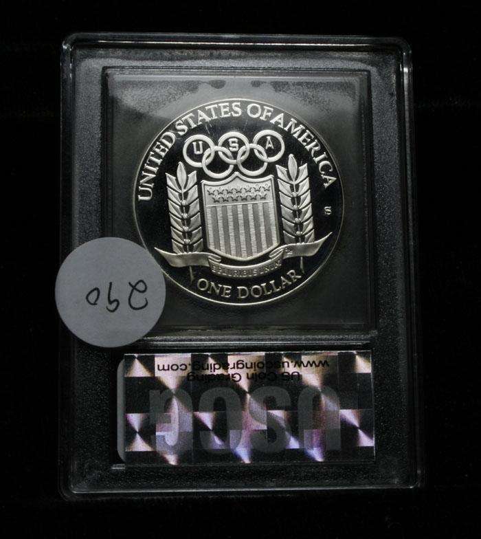 The 1992 Olympic Silver Dollar was issued for the XXV Olympic Games. The 1992 Olympic Silver Dollar Commemorative coin features a baseball player throwing a pitch. Although it is very similar to an image of Nolan Ryan which appeared on a Fleer baseball card. The designer of the coin John R. Deecken denied that there was any connection. PCGS lists PR70 DCAM at $1650, very scarce. This coin is graded PR70 DCAM by USCG. Estimated Value $250