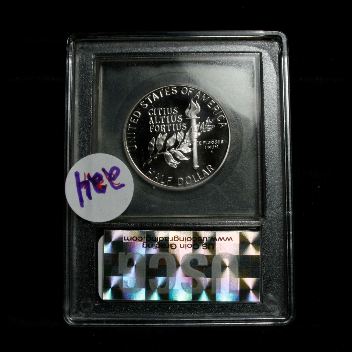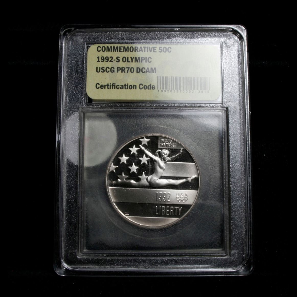 1992-s Olympic Modern Commem Half Dollar 50c Graded GEM++ Proof Deep Cameo By USCG. The 1992 Olympic Proof Half Dollar was issued for the XXV Olympic Games. This commemorative has an olympic gynmast on the obverse. This coin is graded Perfection Gem+++ Proof DCAM by USCG.