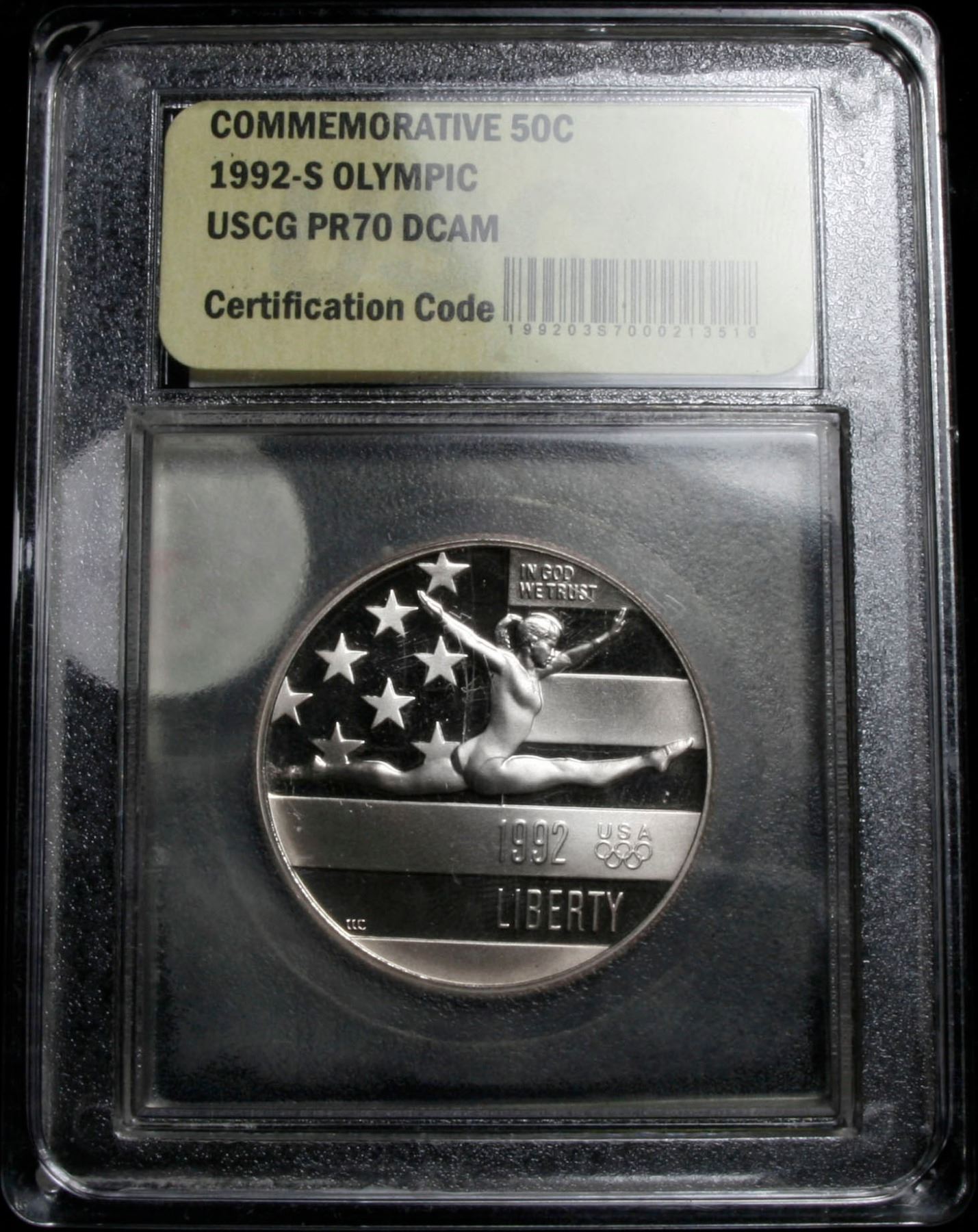 1992-s Olympic Proof Modern Commem Half Dollar 50c Graded GEM++ Proof Deep Cameo by USCG. The 1992 Olympic Proof Half Dollar was issued for the XXV Olympic Games. This commemorative has an olympic gynmast on the obverse. This coin is graded Perfection Gem+++ Proof DCAM by USCG.