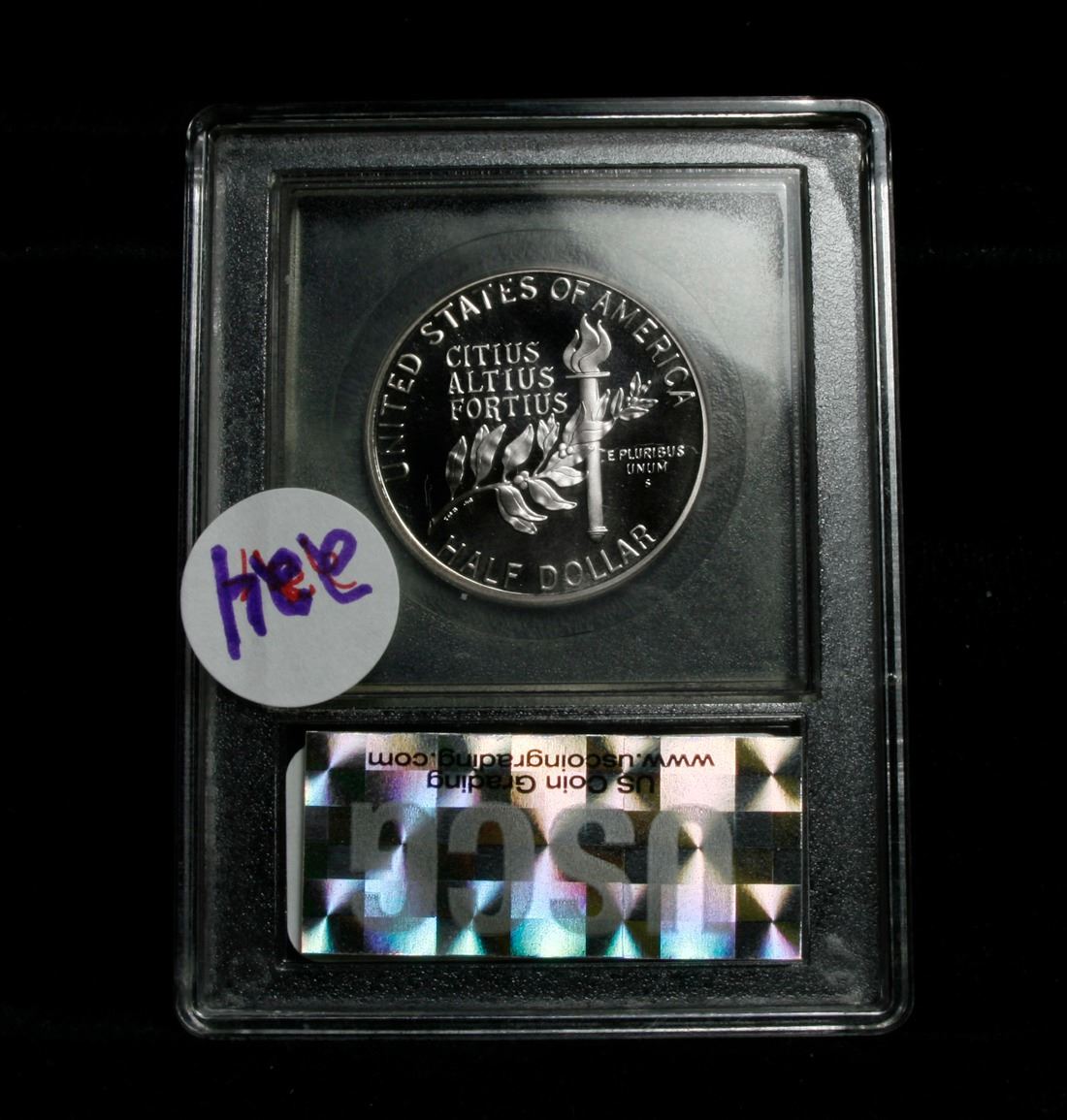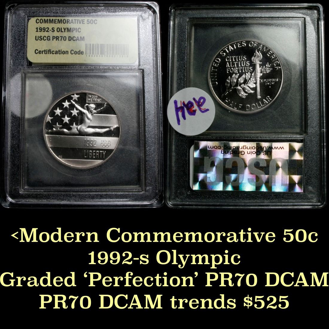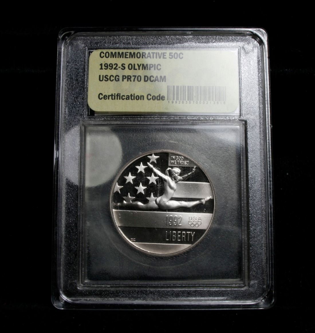 1992-s Olympics . . Proof Commem Half Dollar 50c Graded GEM++ Proof Deep Cameo By USCG. The 1992 Olympic Silver Dollar was issued for the XXV Olympic Games. The 1992 Olympic Silver Dollar Commemorative coin features a baseball player throwing a pitch. Although it is very similar to an image of Nolan Ryan which appeared on a Fleer baseball card. The designer of the coin John R. Deecken denied that there was any connection. PCGS lists this coin as very scarce. This coin is graded Perfect Gem+++ Proof DCAM by USCG.
