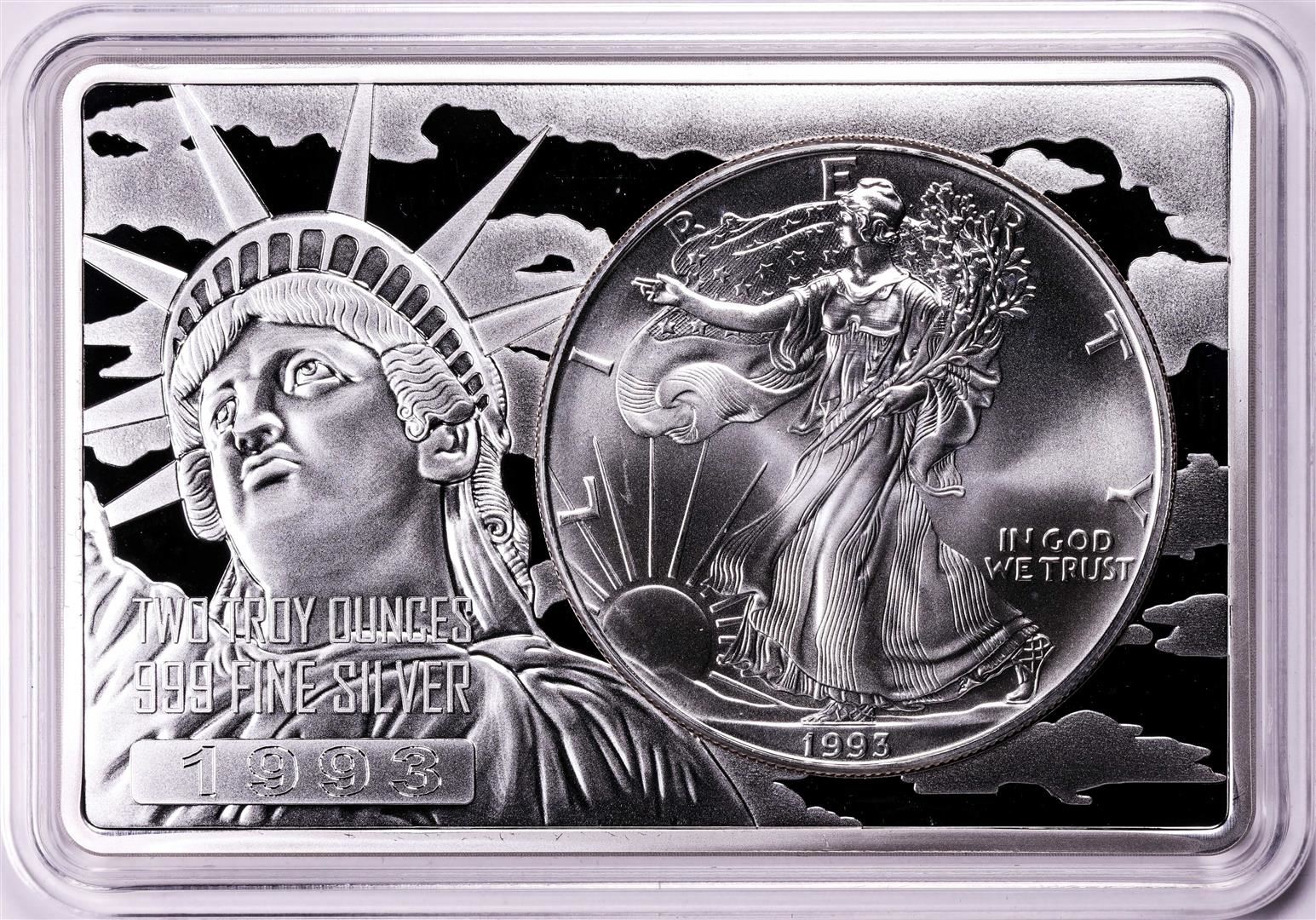 One 1993 $1 American Silver Eagle Coin & 2oz Silver Bar Set.