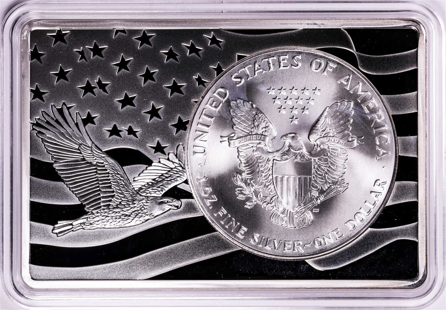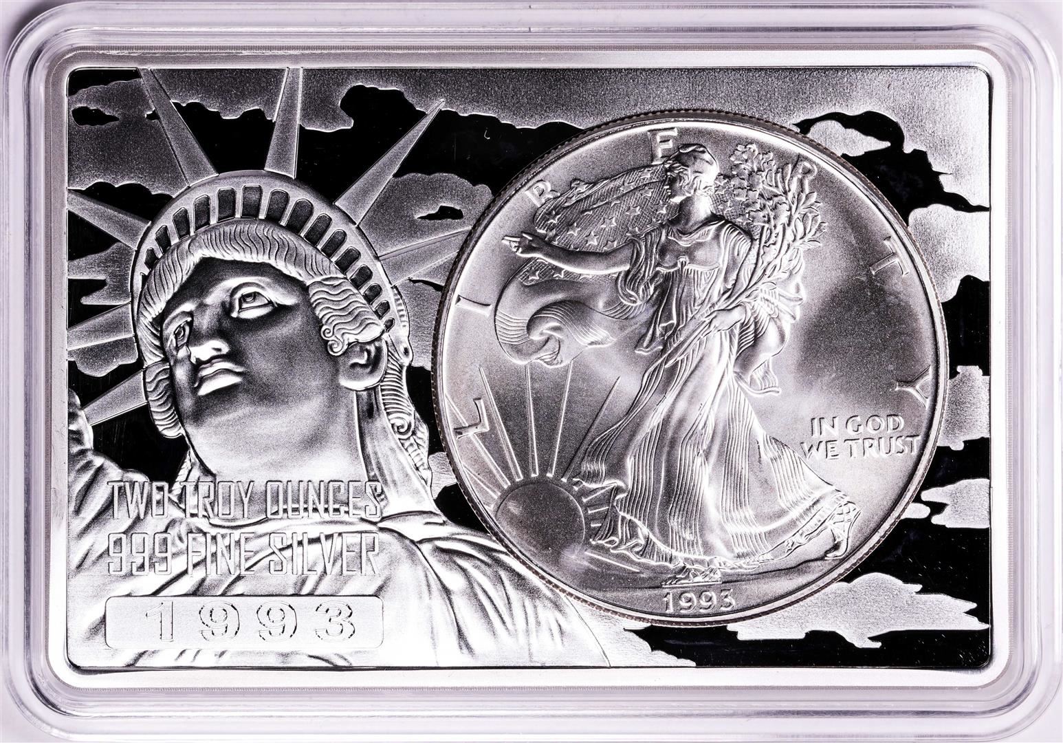 One 1993 $1 American Silver Eagle Coin & 2oz Silver Bar Set.