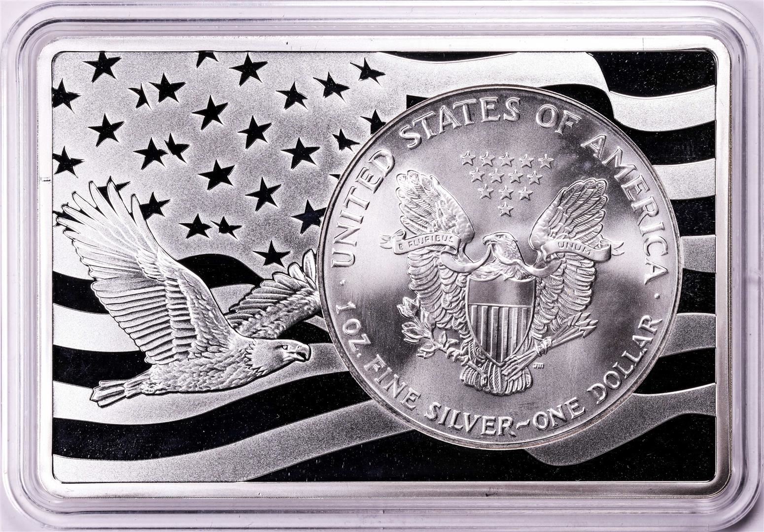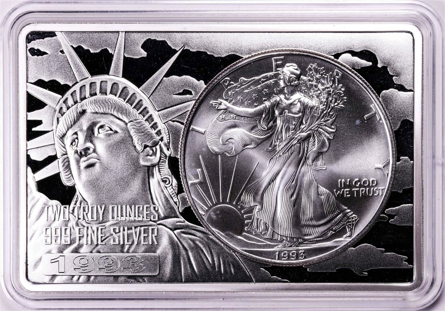 One 1993 $1 American Silver Eagle Coin & 2oz Silver Bar Set.