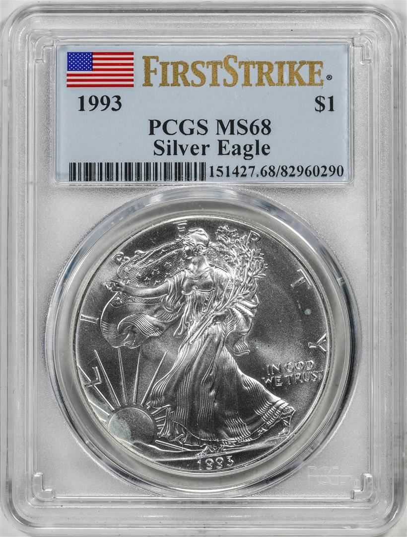 One 1993 $1 American Silver Eagle Coin PCGS MS68 First Strikes. PCGS Graded.