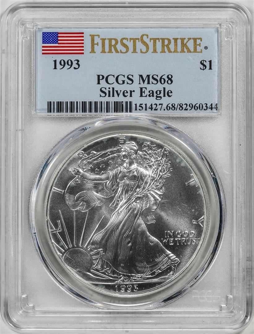 One 1993 $1 American Silver Eagle Coin PCGS MS68 First Strikes. PCGS Graded.
