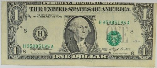 1993 $1 ERROR NOTE, OBV. SERIAL # LOW + OFF-CUT