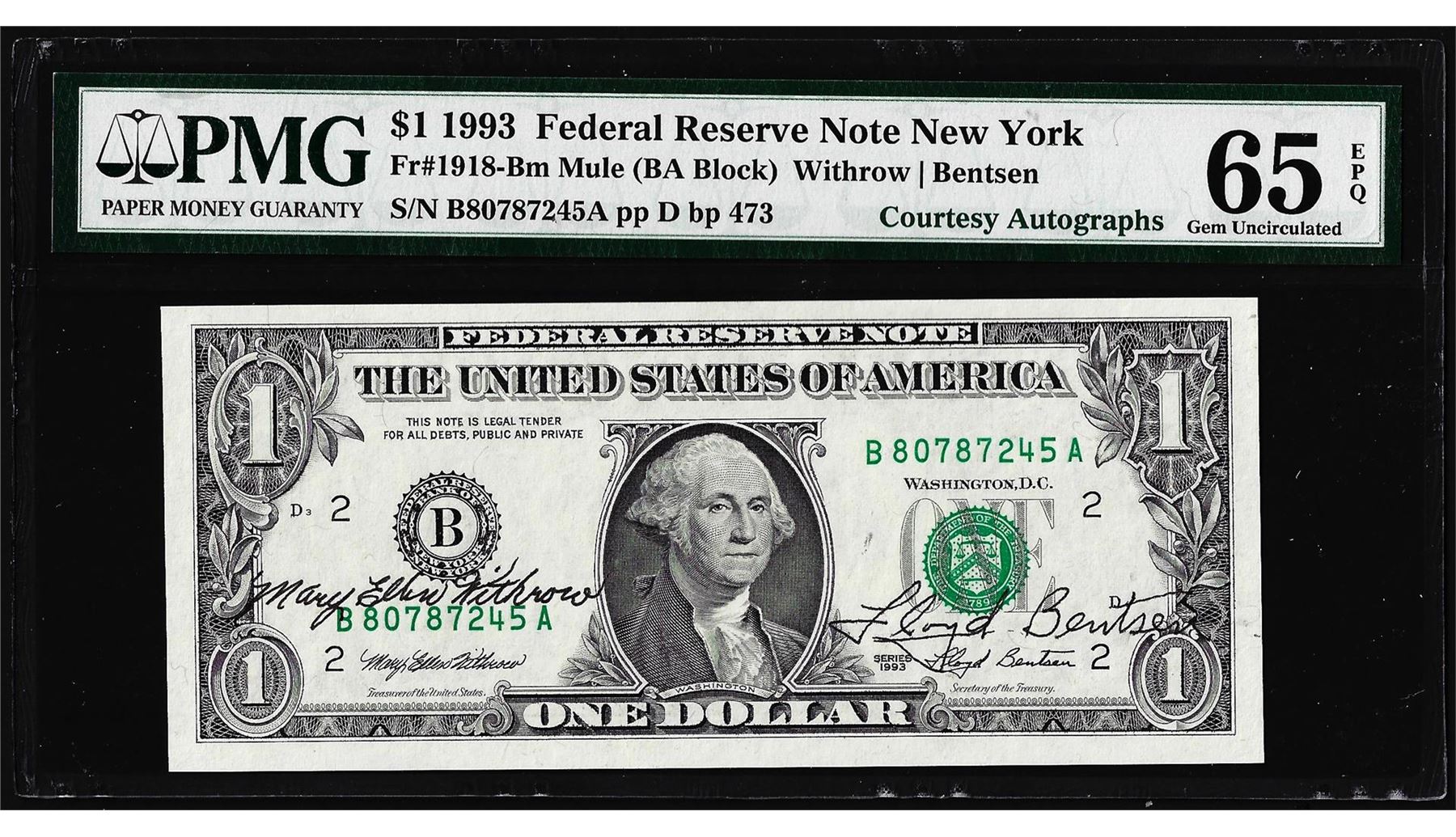 1993 $1 Federal Reserve Note PMG Gem Uncirculated 65EPQ Dual Courtesy Autographs
