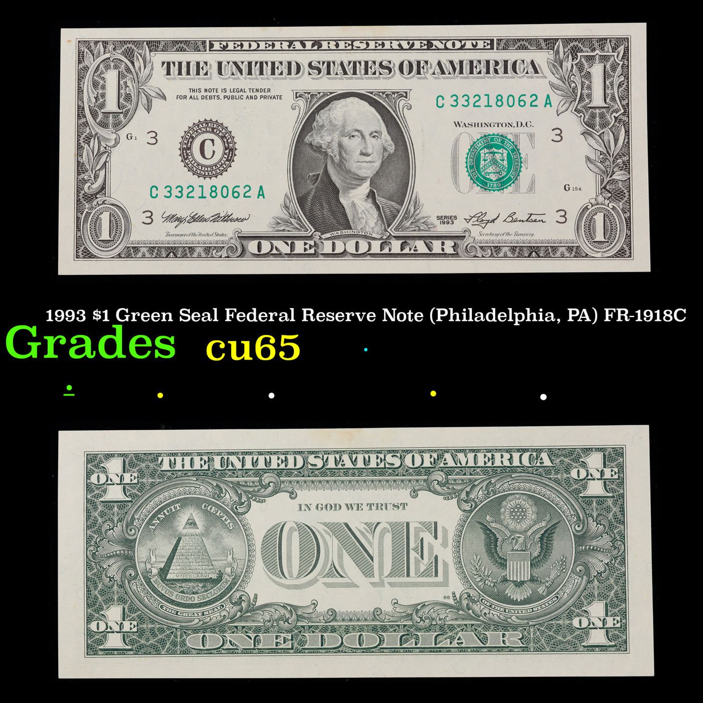1993 $1 Green Seal Federal Reserve Note (Philadelphia, PA) FR-1918C Grades Gem CU.