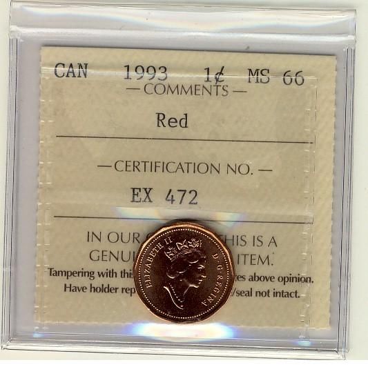 1993 1¢ ICCS MS66 Full Red, A superb GEM example.