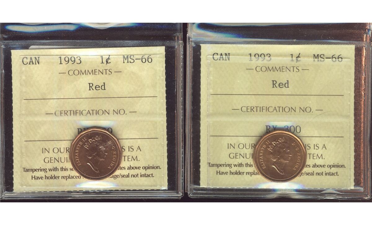 1993 1¢ ICCS MS66RD. Lot of 2 coins.