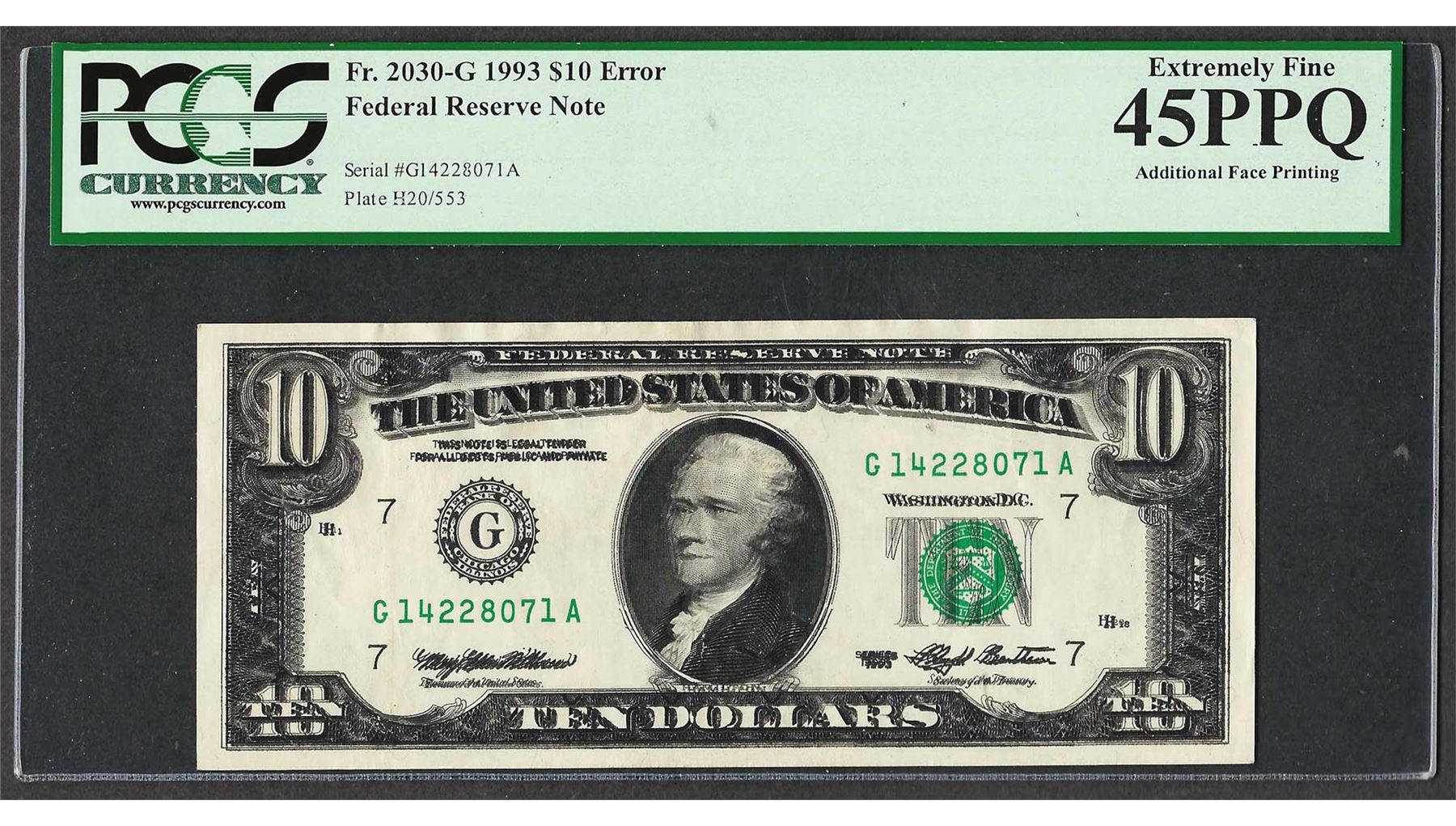 One 1993 $10 Federal Reserve Note ERROR Additional Face Printing PCGS XF45PPQ. PCGS Graded.
