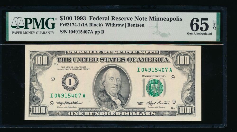 One 1993 $100 Minneapolis FRN PMG 65EPQ.