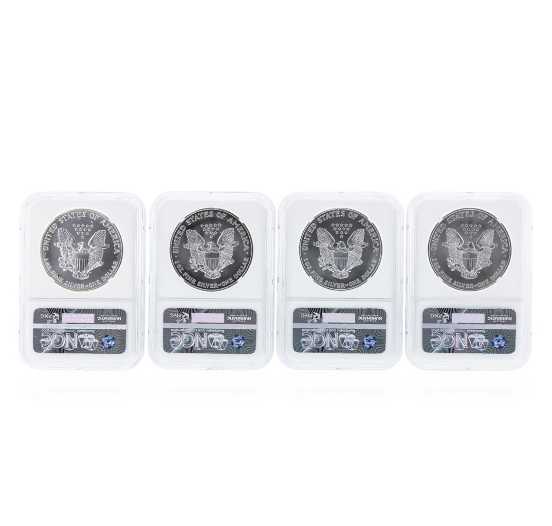 One 1993-1996 NGC MS69 $1 American Silver Eagle Coin Set. The set features a 1993 NGC MS69 $1 American Silver Eagle Coin, 1994 NGC MS69 $1 American Silver Eagle Coin, 1995 NGC MS69 $1 American Silver Eagle Coin, 1996 NGC MS69 $1 American Silver Eagle Coin. NGC Certified.