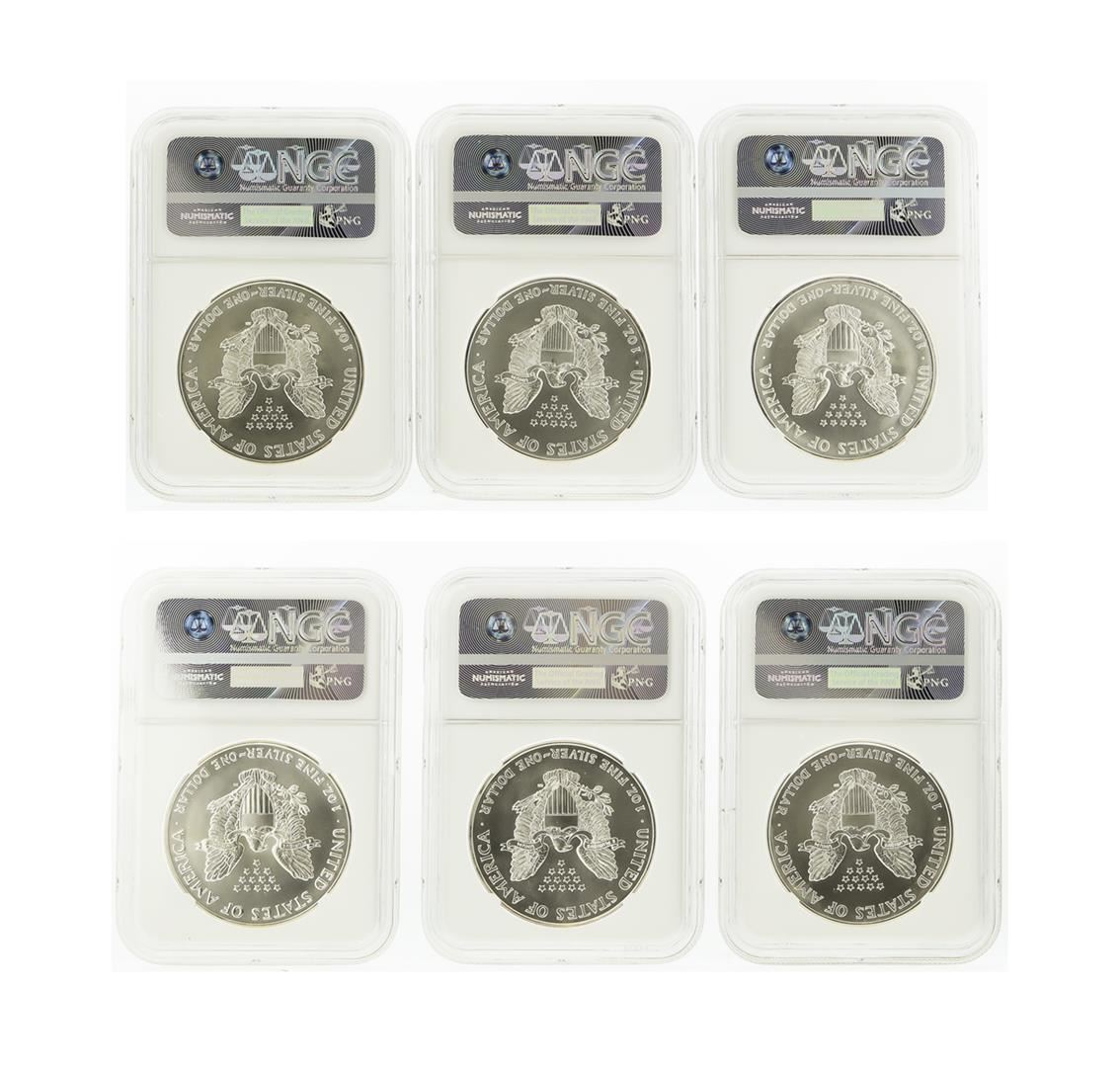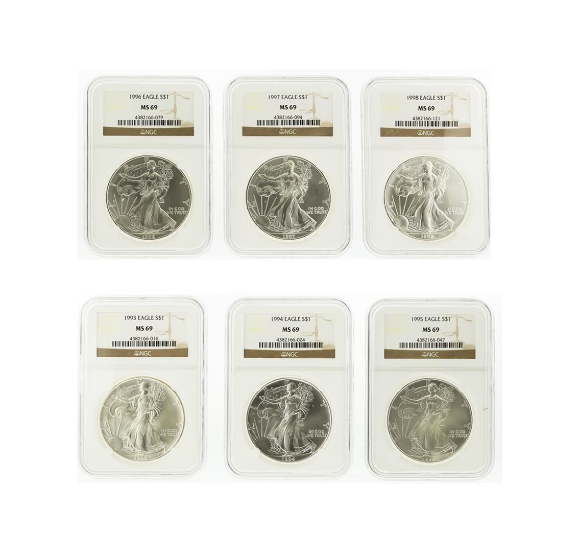 NGC MS69 American Silver Eagle Coin Set of 6 featuring: 1993 NGC MS69 American Silver Eagle, 1994 NGC MS69 American Silver Eagle, 1995 NGC MS69 American Silver Eagle, 1996 NGC MS69 American Silver Eagle, 1997 NGC MS69 American Silver Eagle, and 1998 NGC MS69 American Silver Eagle. NGC Certified.