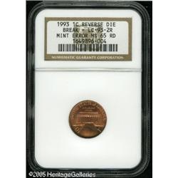 <B>1993 1C  Lincoln Cent--Reverse Die Break--MS65 Red NGC.</B></I> LC-93-2R. A huge die break affects the reverse between 5 and 7 o'clock. The break reaches the central steps of the Lincoln Memorial. As expected, the upper obverse has a featureless depression, since metal flowed to the die break during the strike.    Lot:10890