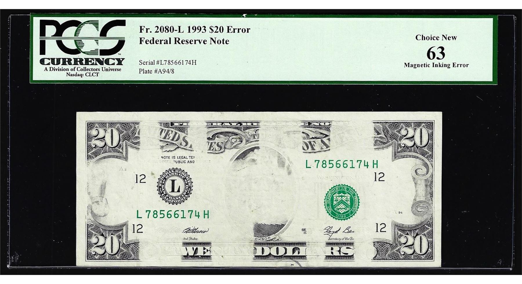 1993 $20 Federal Reserve Note San Francisco Magnetic Ink Error PCGS Choice New 63