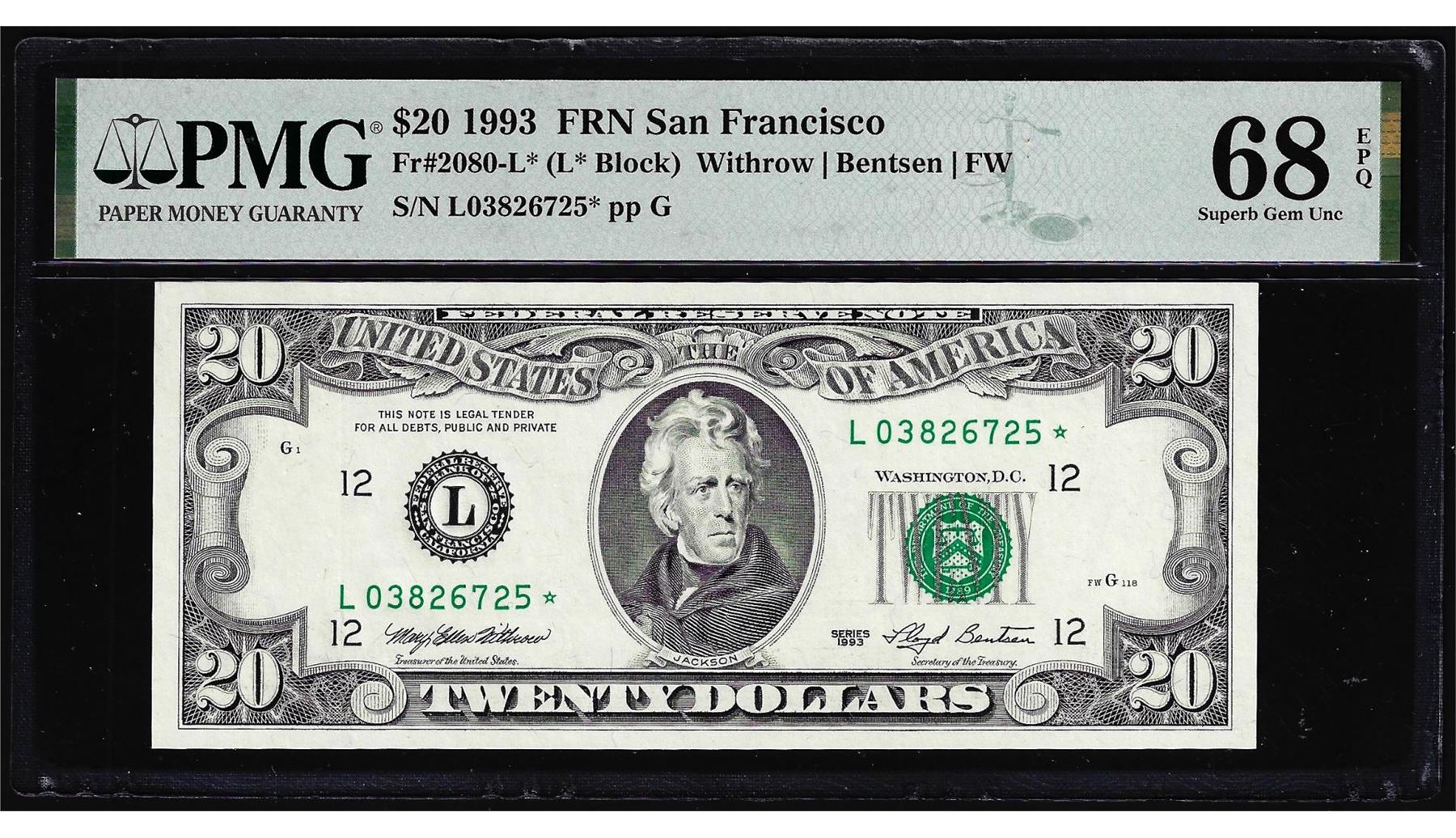 One 1993 $20 Federal Reserve STAR Note San Francisco Fr.2080-L* PMG Superb Gem Unc 68EPQ. PMG Certified.