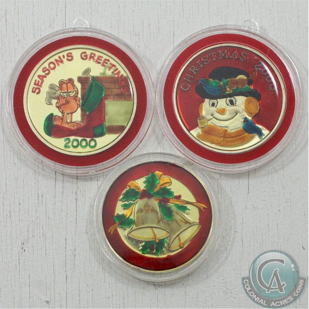 1993 & 2000 Holiday Themed 1oz .999 Fine Silver Coloured and gilded coins. You will receive 1x 1993 Christmas Bells coloured and gilded, 1x 2000 Garfield Seasons Greetings and 1x 2000 Snowman Christmas Round (Tax Exempt) 3pcs