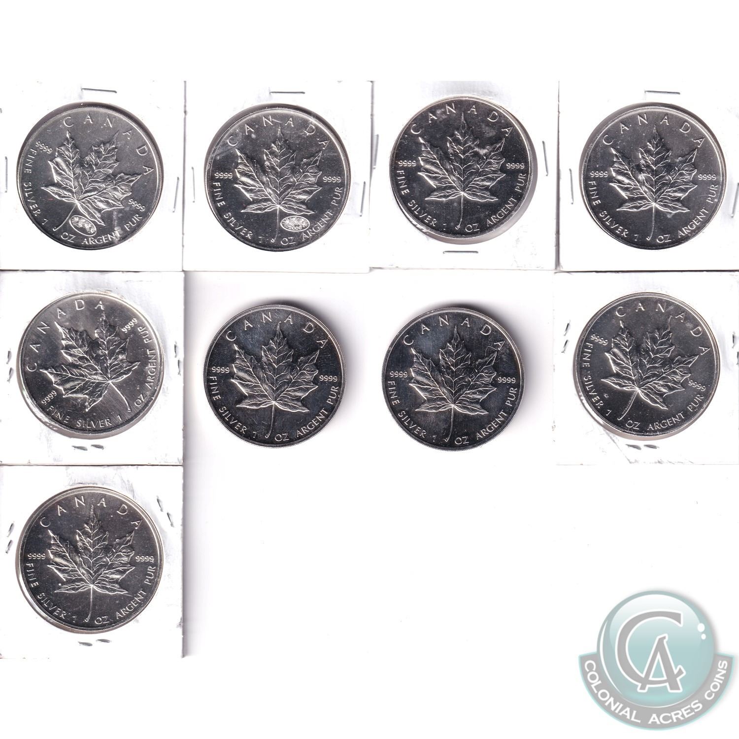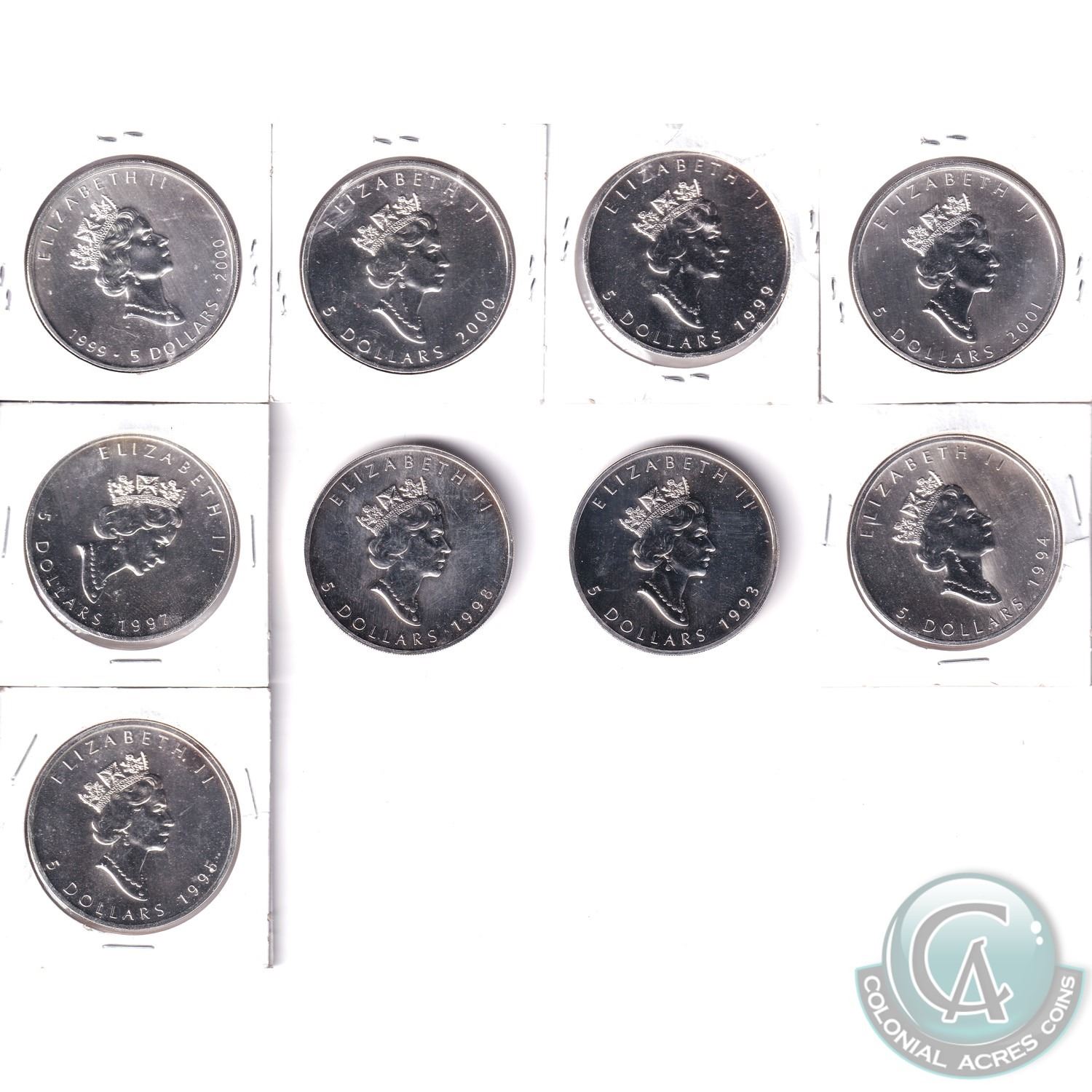 1993-2001 Canada $5 1oz Fine Silver Maple Collection (Tax Exempt) Toned. You will receive the 1993, 1994, 1995, 1997, 1998, 1999, 1999-2000 Fireworks Privy, 2000 Fireworks Privy, and 2001 Coins. 9pcs.