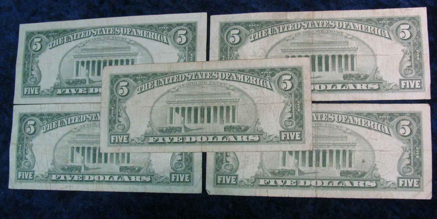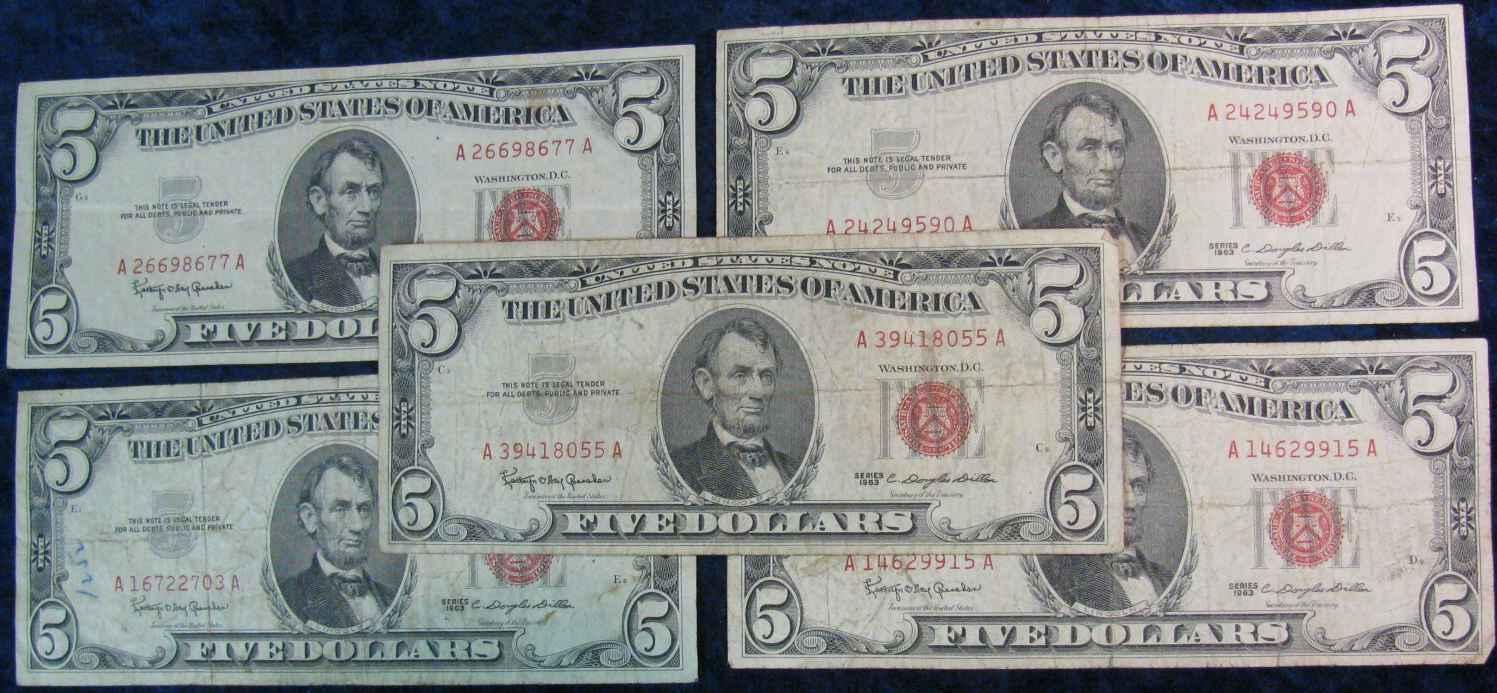1993. (5) Series 1963 $5 U.S. Notes. F-VF. All with red seals.