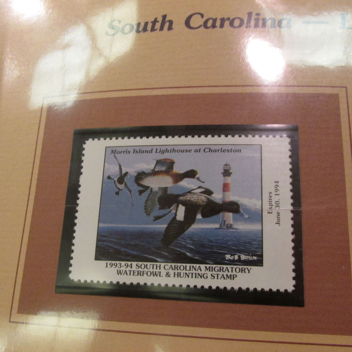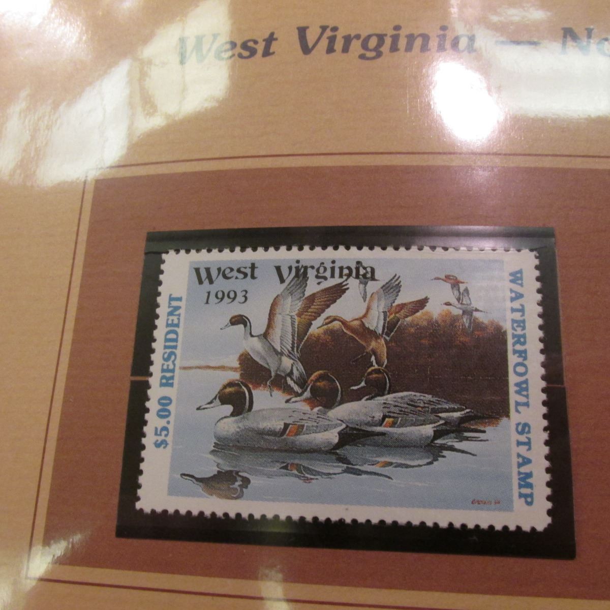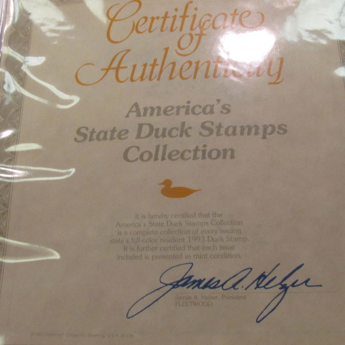 1993 Album "America's State Duck Stamps Collection A complete mint stamp collection of new and beautiful wildlife conservation stamps inspired by the popular Federal Duck Stamp and issued by forty-eight American states in 1993", These are all cherry Mint condition and in a simulated leather binder with gold lettering. Valued by Sam Houston Duck Co. at over $450.00.