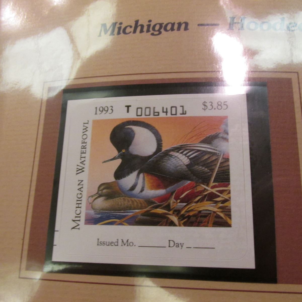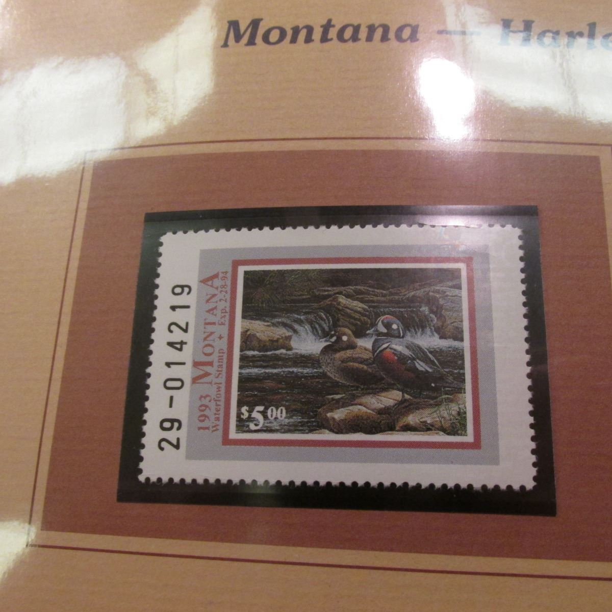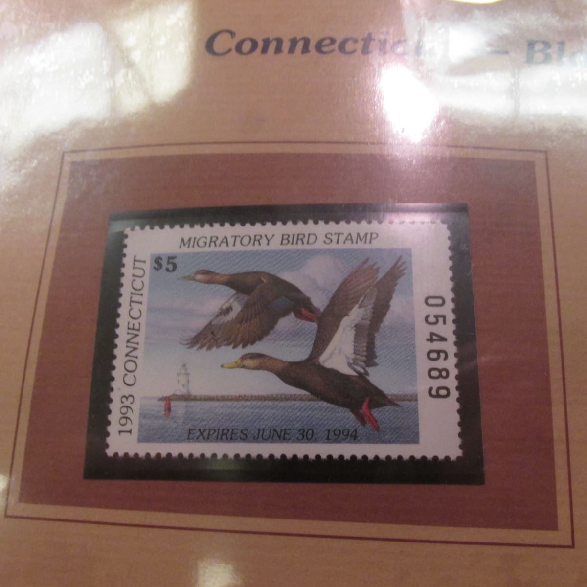 1993 Album "America's State Duck Stamps Collection A complete mint stamp collection of new and beautiful wildlife conservation stamps inspired by the popular Federal Duck Stamp and issued by forty-eight American states in 1993", These are all cherry Mint condition and in a simulated leather binder with gold lettering. Valued by Sam Houston Duck Co. at over $450.00.