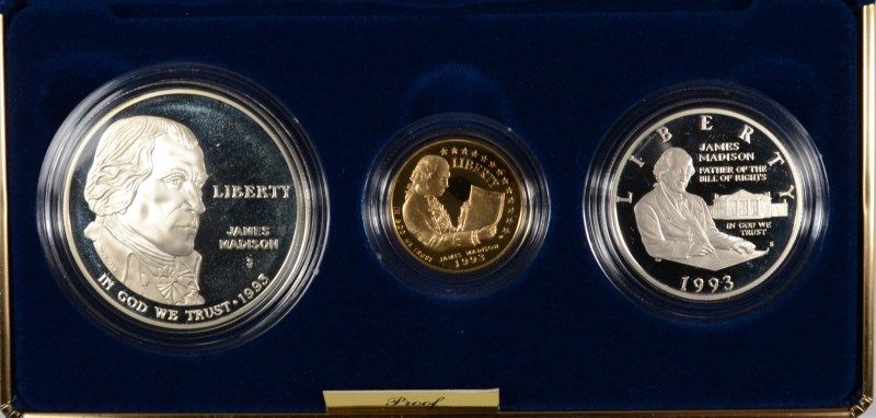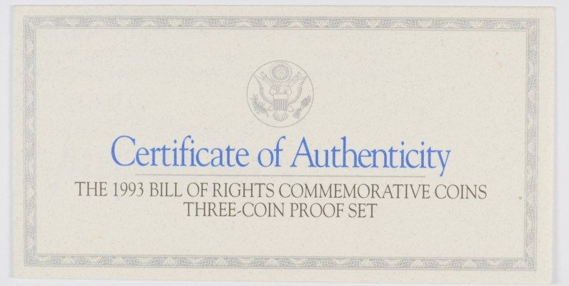 1993 BILL OF RIGHTS 3 PIECE COMMEM. SET: $5 GOLD, SILVER DOLLAR AND HALF DOLLAR