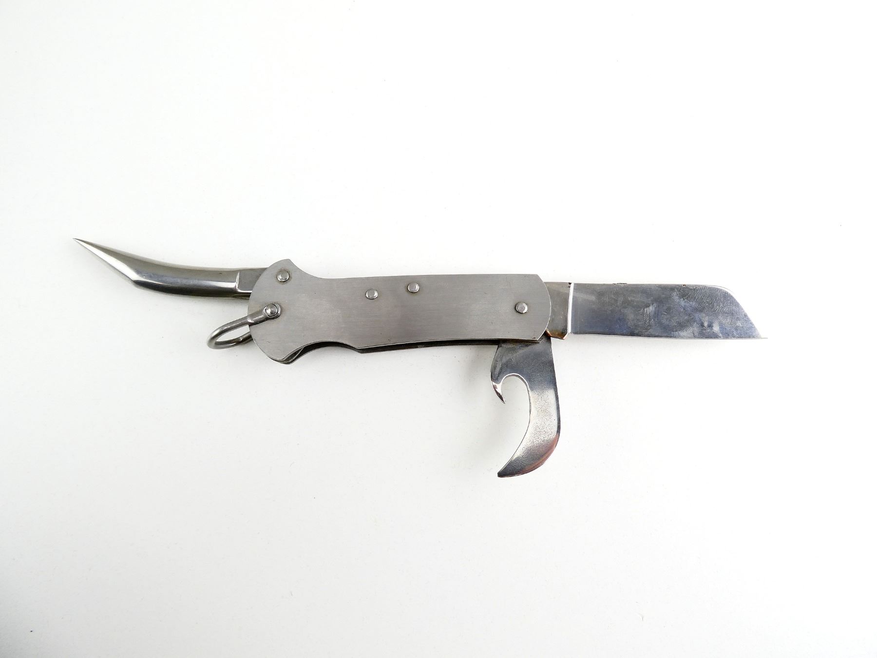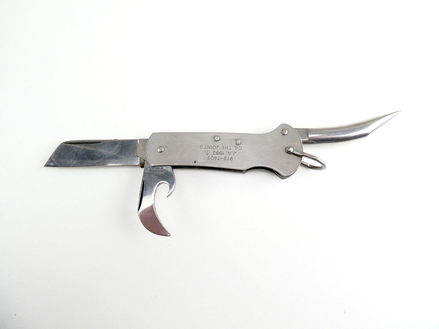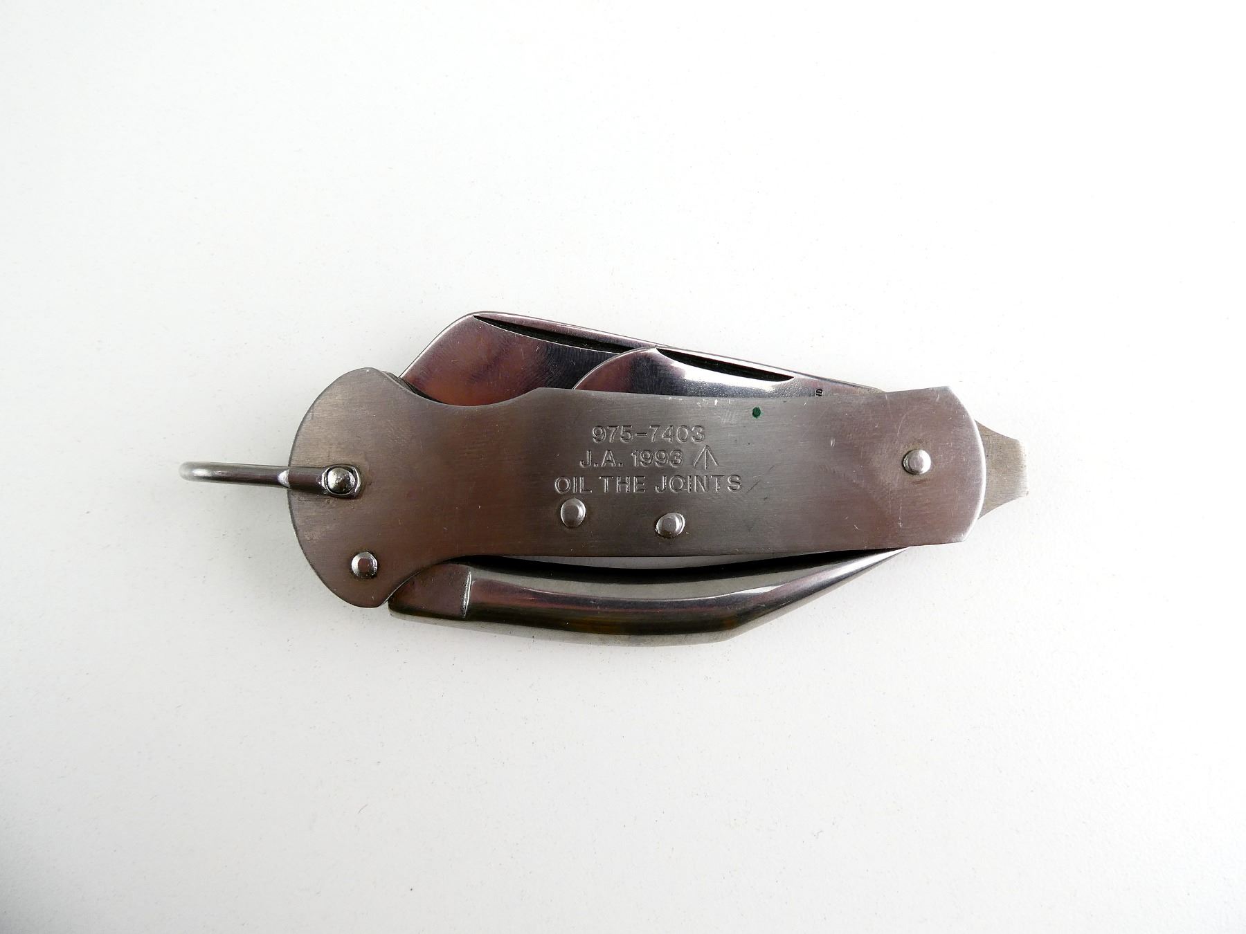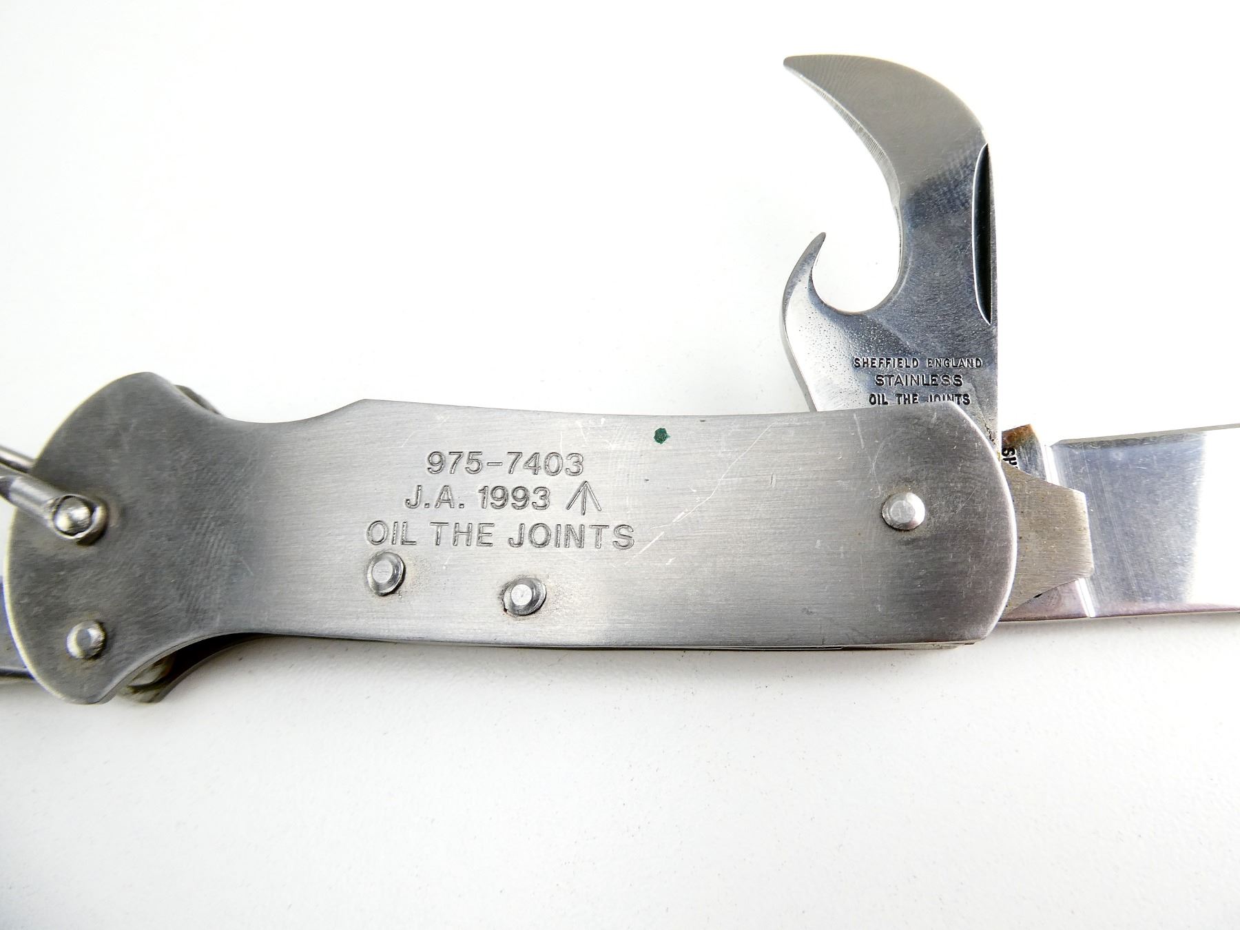 (1) MARLIN SPIKE KNIFE WITH ONE SPIKE, ONE FOLDING BLADE & ONE CAN OPENER, BLADE MARKED: "SHEFFIELD ENGLAND, STAINLESS", CAN OPENER MARKED: "SHEFFIELD ENGLAND, STAINLESS, OIL THE JOINTS", STAINLESS STEEL HANDLE MARKED: "975-7403, J.A. 1993, OIL THE JOINTS" WITH BROAD ARROW, STEEL LANYARD D-SHAPED RING, SPIKE OAL APPROX. 2.75" & LARGE BLADE OAL APPROX. 2 1/2". SEE PHOTOS.