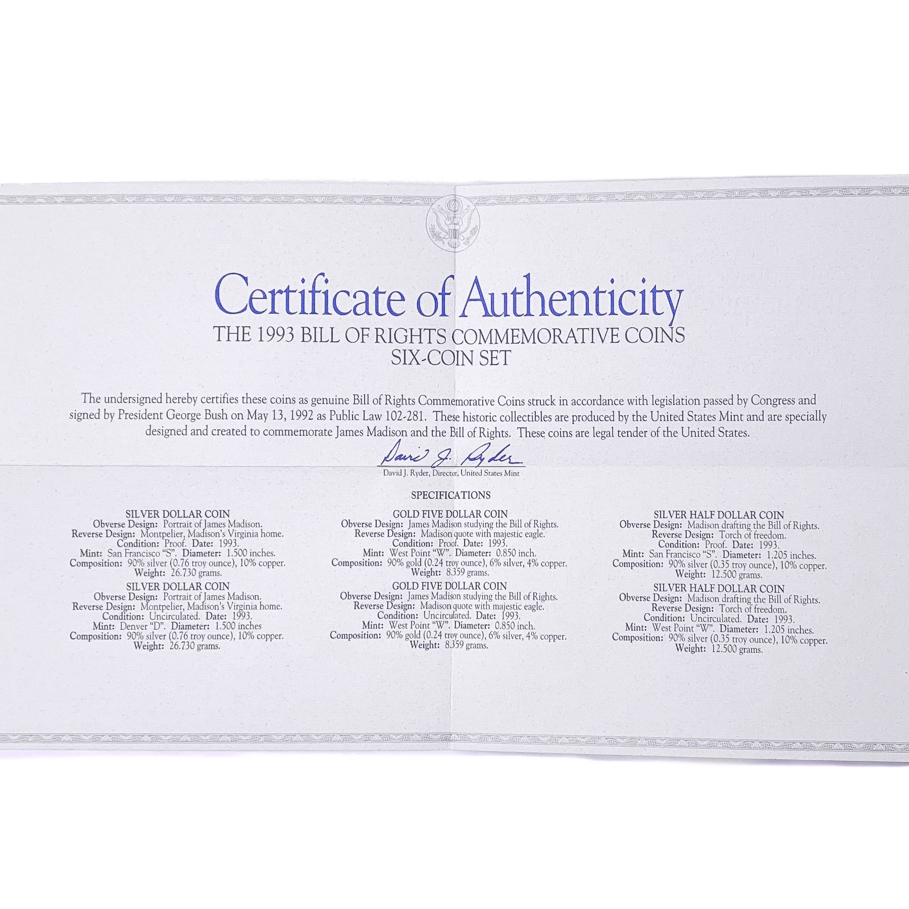 1993 Bill of Rights Commem. Coin set [6 coins]