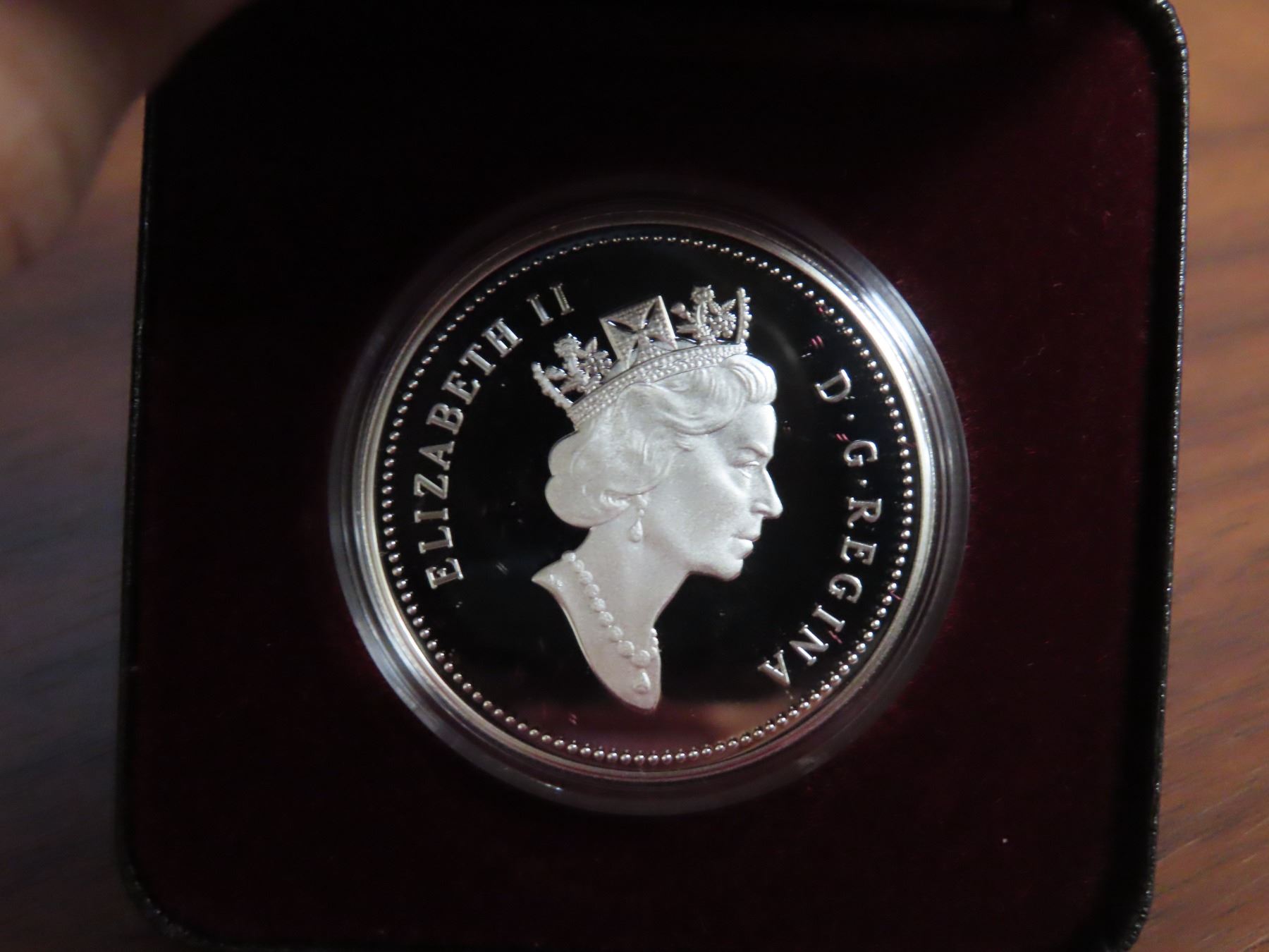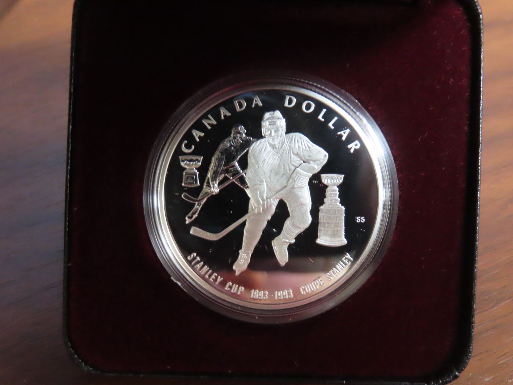 1993 Canadian Proof Silver Dollar. Commemorates Governor General of Canada Lord Stanley presenting the Stanley Cup to the winning hockey team. Ultra Heavy Cameo. Housed in its original Royal Canadian Mint case of issue.
