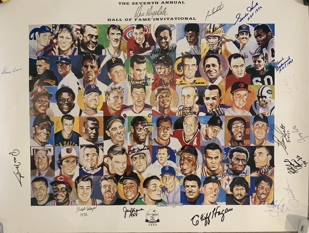 1993 Don Drysdale Hall Of Fame Invitational signed poster autographed by Gordie Howe, Fran Tarkenton, Ray Nitzke, Red Kelly, Chuck Bednarik, Steve Scott, George Latka, Lem Barney, Bob Pettit, Rich Saul, Julius Erving, Rollie Fingers, Cliff Hagan, George Yardley, Bill Sharman, Tom Fears, Jack Kramer, Paul Warfield, Ed Macauley, Stan Mikita, Otto Graham, Sam Jones, Duke Snyder, Dolph Schayes, Frank Mahovich, Dennis Murphy, Glenn Davis and Tom Gola