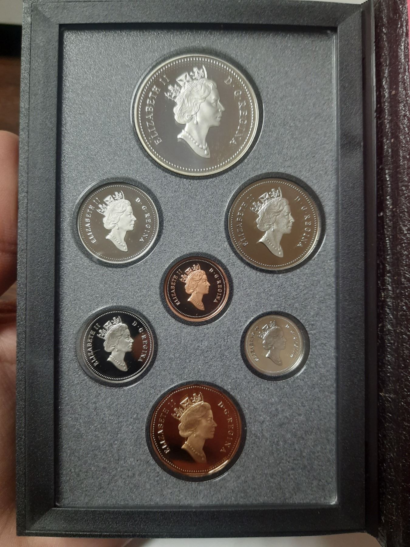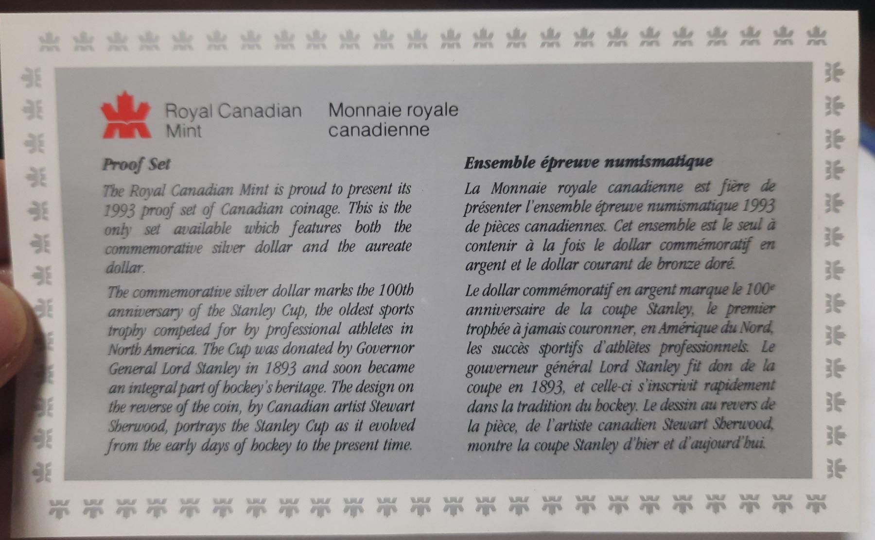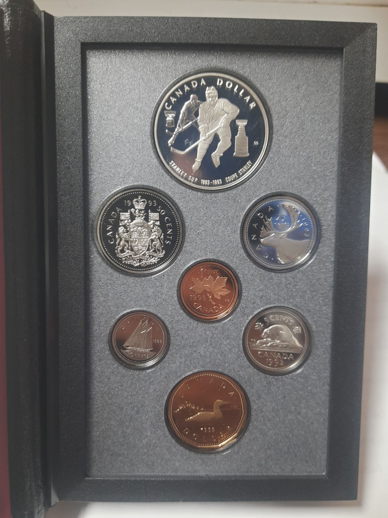 1993 Double Dollar Proof Set. 7-coin set includes a Sterling Silver Dollar that commemorates the 100th Anniversary of Governor General of Canada, Lord Stanley, presenting the Stanley Cup to the winning hockey team. Proof with Ultra Heavy Cameos.
